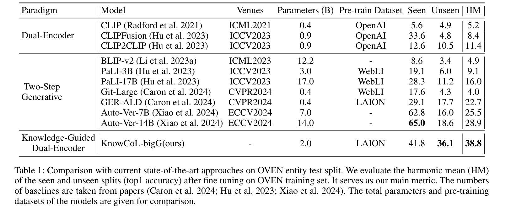 - 在OVEN基准测试集上的实验显示,整合多种知识来源(视觉、文本、结构化)能显著提高准确率。