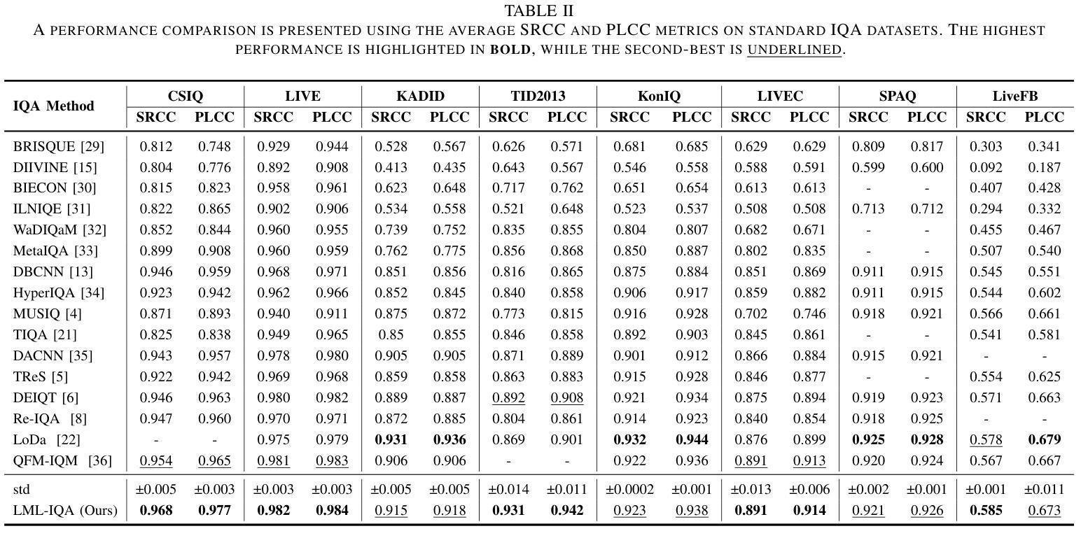 - 在CSIQ数据集上,LML-IQA的PLCC达到0.977,相较于现有最佳方法的0.965有所改进。