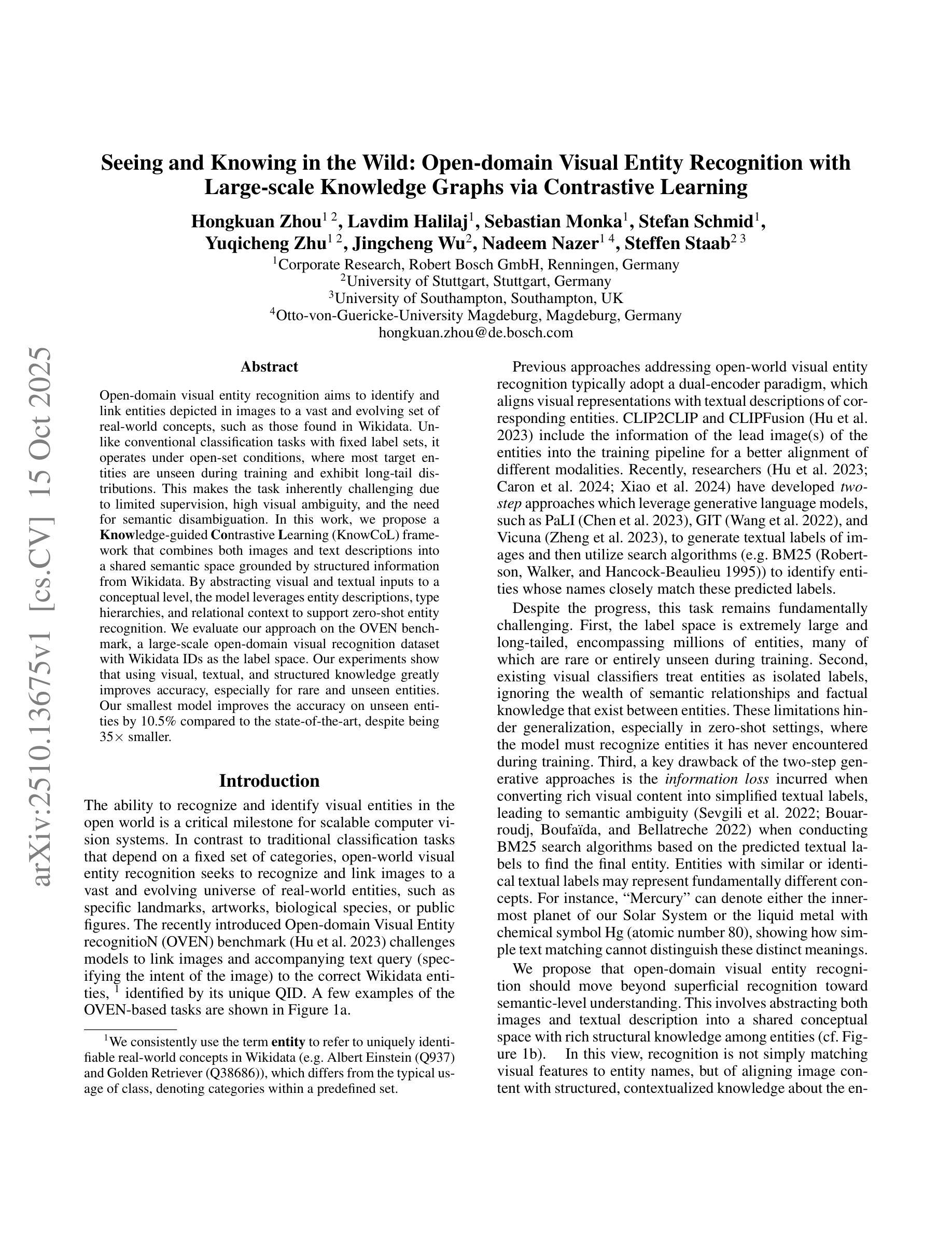 本文介绍了开放域视觉实体识别任务,旨在将图像中的实体与WikiData等大型不断变化的概念集进行识别与链接。针对此任务的挑战,提出了一个知识引导对比学习(KnowCoL)框架,结合了图像和文本描述,以WikiData的结构化信息为根基,形成一个共享语义空间。该模型通过抽象视觉和文本输入到概念层面,利用实体描述、类型层次结构和关系上下文来支持零样本实体识别。在OVEN基准测试集上的实验表明,使用视觉、文本和结构化知识大大提高了准确性,特别是对于罕见和未见过的实体。即使是最小的模型,其未见实体的准确率也比最新技术高出10.5%,且模型大小仅为前者的35倍。