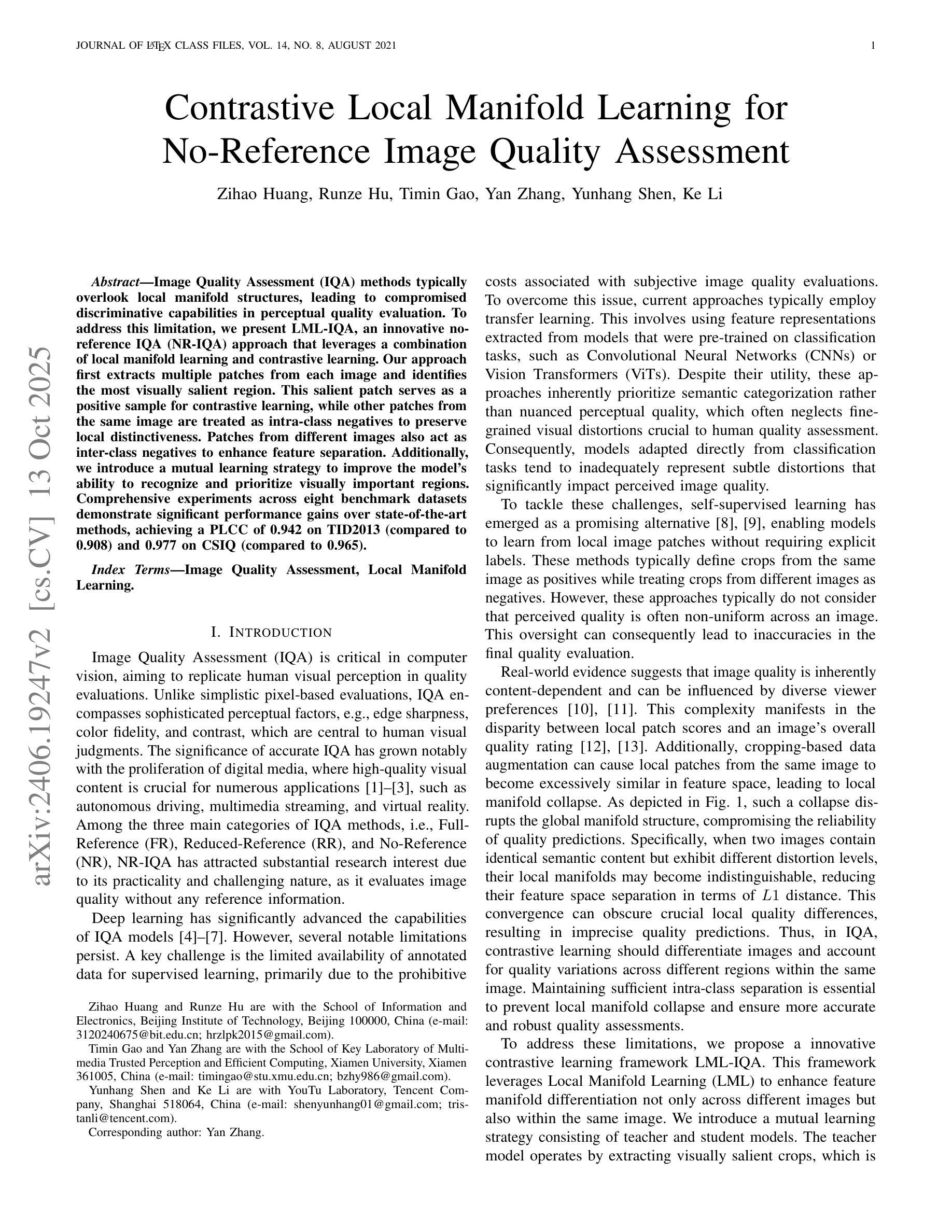 图像质量评估(IQA)方法通常忽略了局部流形结构,导致在感知质量评估中的辨别能力受损。为了解决这一局限性,我们提出了LML-IQA,这是一种创新的无参考IQA(NR-IQA)方法,它结合了局部流形学习和对比学习。我们的方法首先从每张图片中提取多个斑块(patches),并识别出视觉上最突出的区域。这个显著的斑块作为对比学习的正样本,而其他来自同一图像的斑块则被当作类内负样本,以保留局部独特性。来自不同图像的斑块也作为类间负样本,以增强特征分离。此外,我们还引入了一种相互学习策略,以提高模型识别和优先处理视觉重要区域的能力。在八个基准数据集上的综合实验表明,与最先进的方法相比,我们的方法在性能上取得了显著的提升,在TID2013上的PLCC达到了0.942(相比之前的0.908),在CSIQ上的PLCC达到了0.977(相比之前的0.965)。
