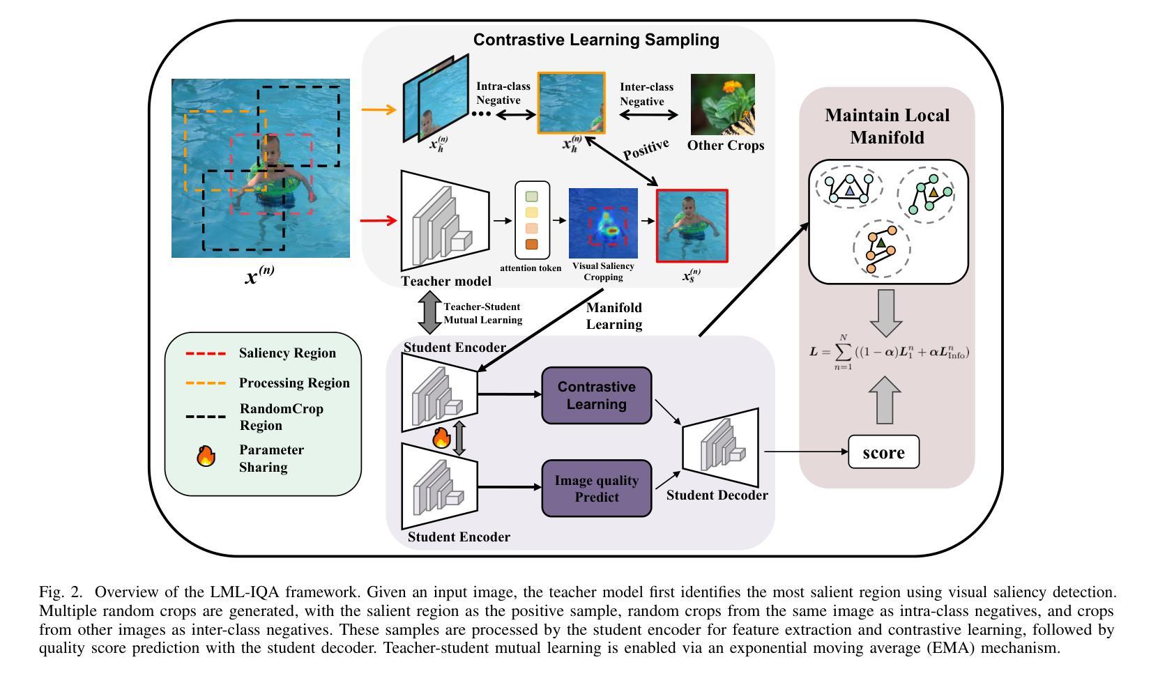 提出了一种新的无参考图像质量评估(NR-IQA)方法LML-IQA,该方法结合局部流形学习和对比学习,以改善感知质量评估中的判别能力。通过对图像的多块区域提取和显著区域的识别,利用对比学习机制进行训练,同时在模型中加入互学习策略。在八个基准数据集上的实验表明,与最新方法相比,性能有了显著的提升。
