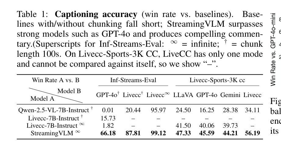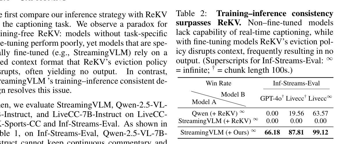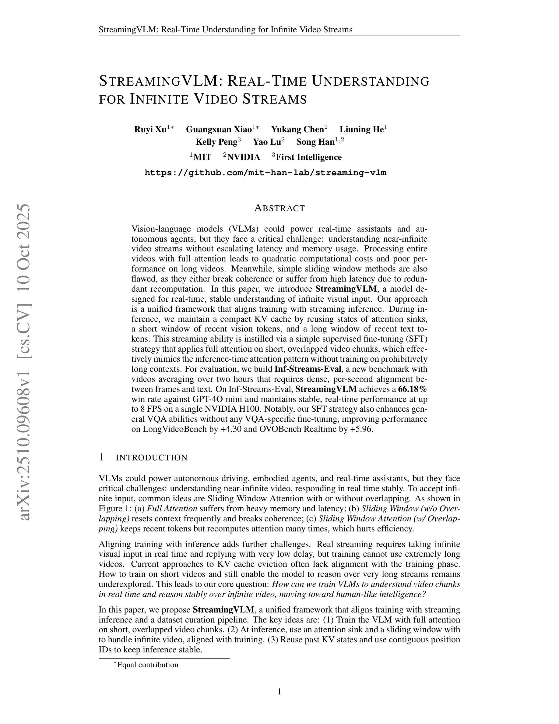 视觉语言模型(VLM)能够为实时助理和自主代理提供强大的支持,但它们面临一项重大挑战:在无限接近于无穷的视频流中理解内容,同时不会增加延迟和内存使用。对整段视频进行全面关注处理会导致计算成本呈二次方增长,并且在处理长视频时表现不佳。同时,简单的滑动窗口方法也存在缺陷,因为它们要么破坏连贯性,要么由于冗余的重新计算而遭受高延迟。在本文中,我们介绍了StreamingVLM模型,该模型专为实时、稳定地理解无限视觉输入而设计。我们的方法是一个统一的框架,将训练与流式推理相结合。在推理过程中,我们通过重用注意力汇聚的状态、最近的视觉令牌短期窗口以及最近的文本令牌长期窗口来保持紧凑的KV缓存。这种流式能力是通过一种简单的有监督微调(SFT)策略灌输的,该策略对重叠的短期视频块应用全注意力,这有效地模仿了推理时的注意力模式,而无需在禁止的过长上下文上进行训练。为了评估性能,我们建立了Inf-Streams-Eval基准测试,这是一个包含平均超过两小时的视频的新基准测试,它要求帧和文本之间密集的每秒对齐。在Inf-Streams-Eval基准测试中,StreamingVLM以66.18%的胜率战胜了GPT-4O mini,并在单个NVIDIA H100上实现了稳定实时的高达8 FPS的性能。值得注意的是,我们的SFT策略还提高了通用的VQA能力,而无需进行任何特定的VQA微调,在LongVideoBench上的性能提高了+4.30,在OVOBench Realtime上的性能提高了+5.96。代码可在https://github.com/mit-han-lab/streaming-vlm找到。