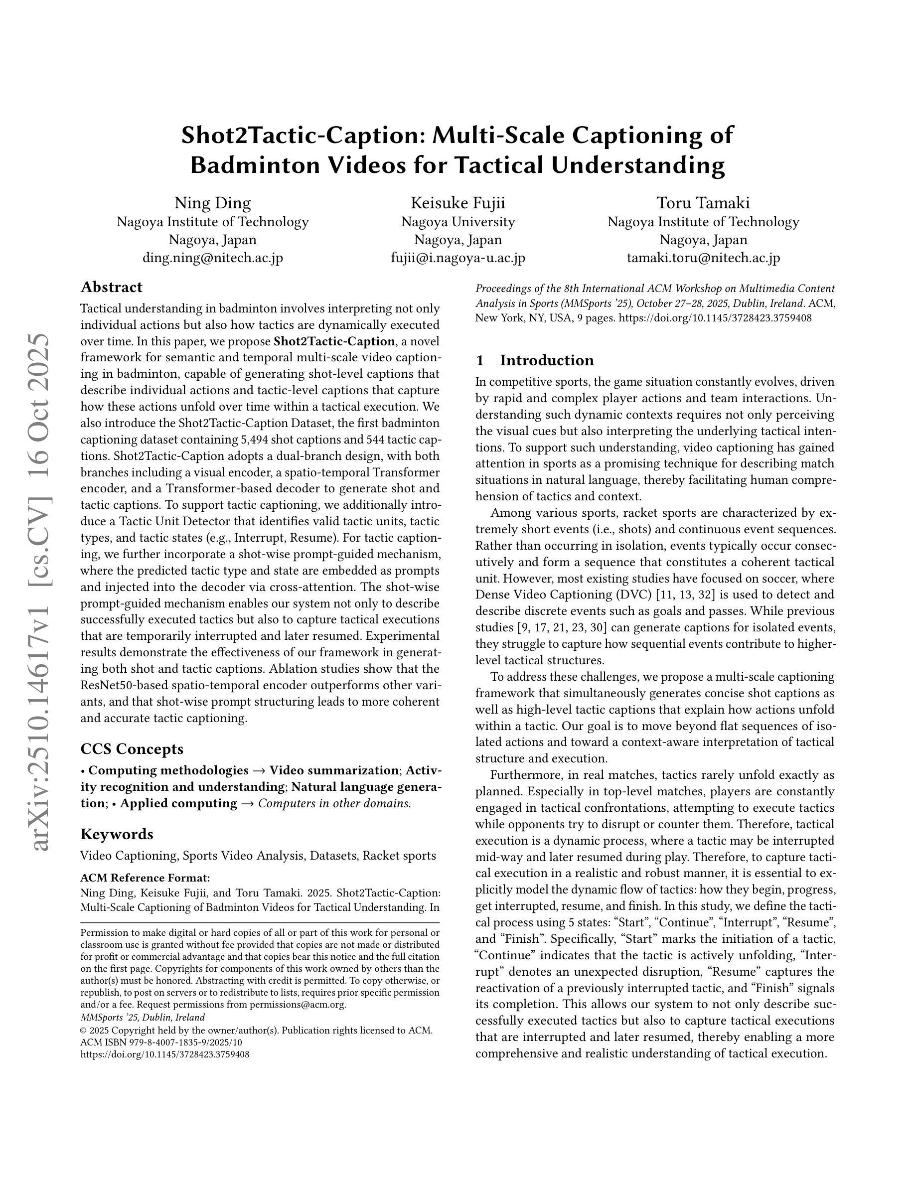 羽毛球战术理解不仅涉及对单个动作的解读,还涉及如何动态执行战术。在本文中,我们提出了一个新的框架Shot2Tactic-Caption,用于羽毛球语义和时间多尺度视频描述生成,能够生成描述单个动作的镜头级描述和捕捉战术执行过程中这些动作随时间展开的战术级描述。我们还介绍了Shot2Tactic-Caption数据集,这是第一个包含5494个镜头描述和544个战术描述的羽毛球描述数据集。Shot2Tactic-Caption采用双分支设计,两个分支都包括视觉编码器、时空Transformer编码器和基于Transformer的解码器,以生成镜头和战术描述。为了支持战术描述生成,我们还引入了一个战术单元检测器,用于识别有效的战术单元、战术类型和战术状态(例如中断、恢复)。对于战术描述,我们进一步采用了一种基于镜头的提示引导机制,将预测的战术类型和状态嵌入为提示,并通过交叉注意力注入解码器。基于镜头的提示引导机制使我们的系统不仅能够描述成功执行的战术,还能够捕捉暂时中断并随后恢复的战术执行。实验结果表明,我们的框架在生成镜头和战术描述方面都非常有效。消融研究表明,基于ResNet50的时空编码器优于其他变体,基于镜头的提示结构导致更连贯和准确的战术描述生成。