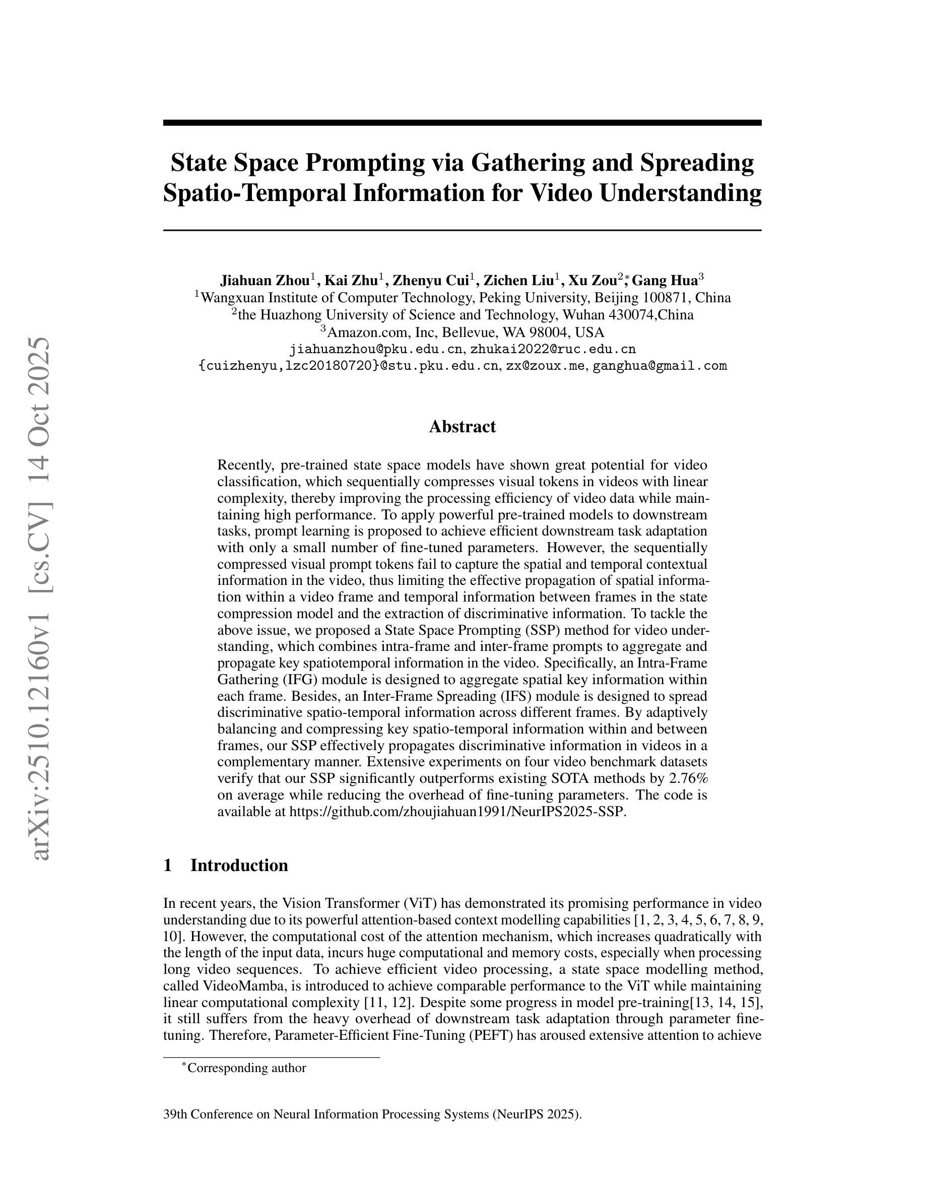 预训练状态空间模型在视频分类中展现巨大潜力,通过线性复杂度压缩视觉令牌提高视频数据处理效率同时保持高性能。为将强大预训练模型应用于下游任务,提出提示学习法,仅需少量参数微调即可实现高效下游任务适应。然而,顺序压缩的视觉提示令牌无法捕获视频中的空间和时间上下文信息,限制了状态压缩模型中空间信息在视频帧内的有效传播以及时间信息在不同帧之间的传播,以及判别信息的提取。为解决上述问题,我们提出一种用于视频理解的状态空间提示(SSP)方法,结合帧内和帧间提示,聚集和传播视频中的关键时空信息。通过自适应平衡和压缩帧内和帧间的关键时空信息,SSP以互补的方式有效传播视频中的判别信息。在四个视频基准数据集上的大量实验验证,我们的SSP方法平均比现有最佳方法高出2.76%,同时降低了微调参数的开销。