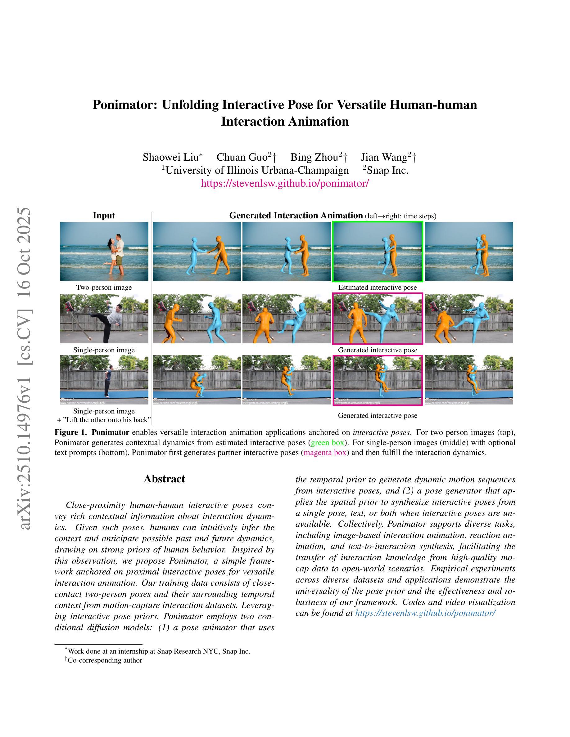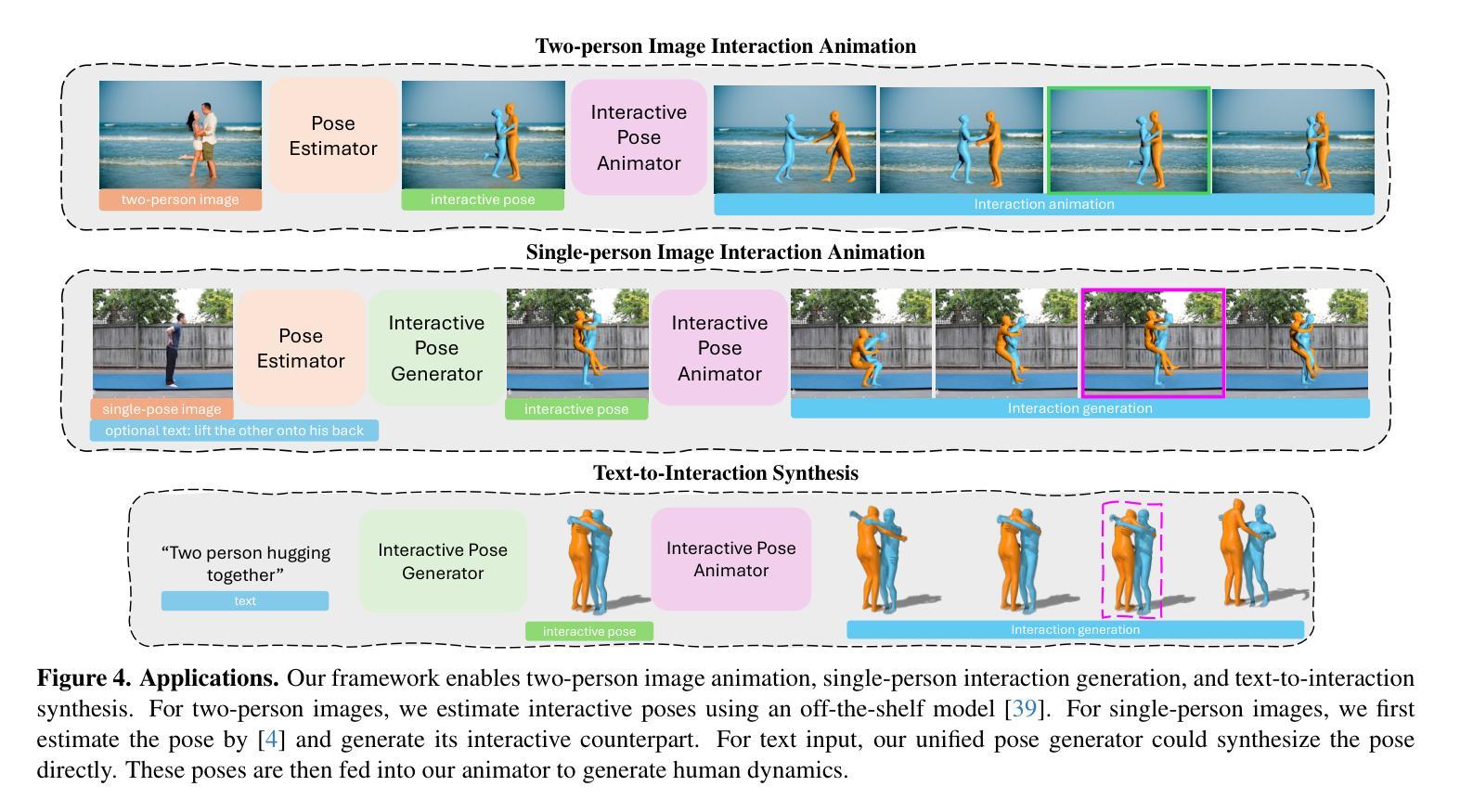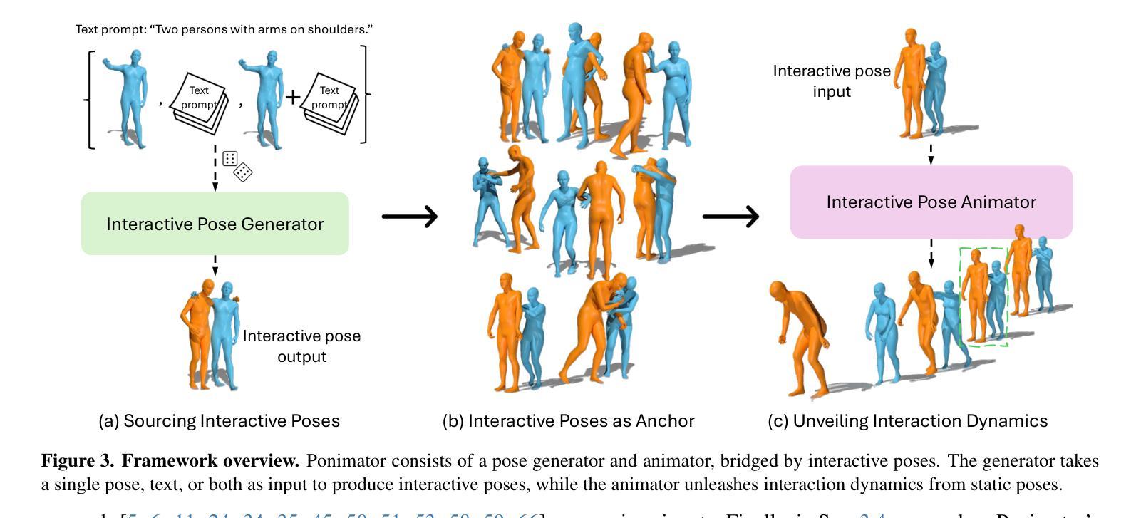 近距离人机交互姿势传达了丰富的交互动态上下文信息。基于这些姿势,人类可以直观地推断上下文并预测可能的过去和未来动态,这依赖于人类行为的强大先验知识。受此观察启发,我们提出了Ponimator,这是一个以近距离交互姿势为基础的通用交互动画简单框架。我们的训练数据来自动作捕捉交互数据集中的近距离双人姿势及其周围的时空上下文。Ponimator利用交互姿势先验,采用两个条件扩散模型:(1)姿态动画师使用时间先验根据交互姿势生成动态运动序列;(2)姿态生成器在交互姿势不可用的情况下,利用空间先验从单个姿势、文本或两者合成交互姿势。总体上,Ponimator支持多样化的任务,包括基于图像的交流动画、反应动画和文本到交流的合成,促进了从高质量mocap数据到开放世界场景的交互知识的转移。在多个数据集和应用上的实验证明了姿态先验的普遍性以及我们框架的有效性和稳健性。