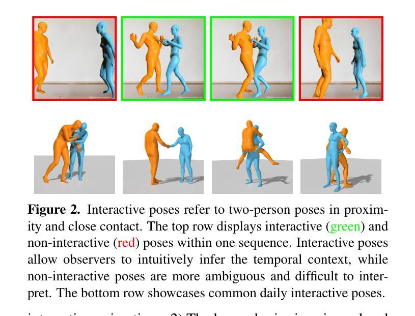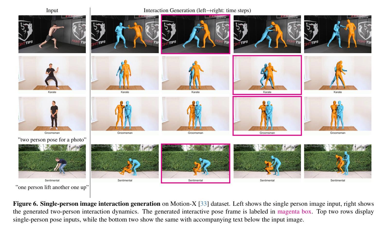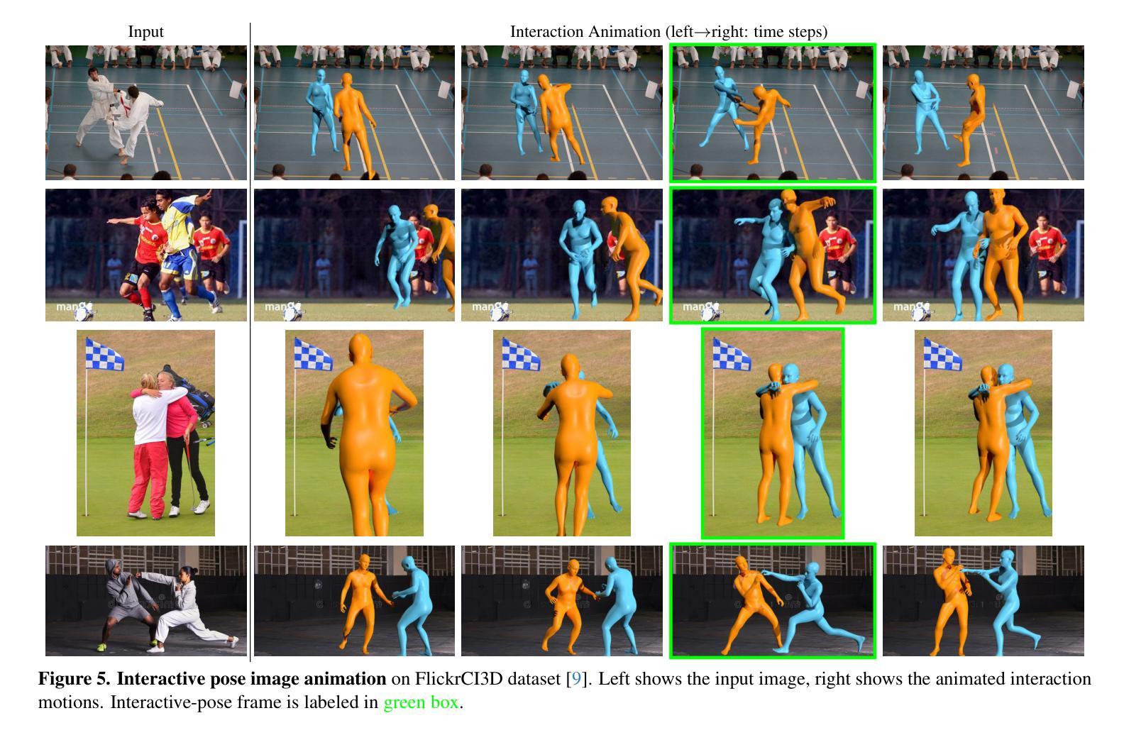近距离人机交互姿势传达了丰富的交互动态上下文信息。基于这些姿势,人类可以直观地推断上下文并预测可能的过去和未来动态,这依赖于人类行为的强大先验知识。受此观察启发,我们提出了Ponimator,这是一个以近距离交互姿势为基础的通用交互动画简单框架。我们的训练数据来自动作捕捉交互数据集中的近距离双人姿势及其周围的时空上下文。Ponimator利用交互姿势先验,采用两个条件扩散模型:(1)姿态动画师使用时间先验根据交互姿势生成动态运动序列;(2)姿态生成器在交互姿势不可用的情况下,利用空间先验从单个姿势、文本或两者合成交互姿势。总体上,Ponimator支持多样化的任务,包括基于图像的交流动画、反应动画和文本到交流的合成,促进了从高质量mocap数据到开放世界场景的交互知识的转移。在多个数据集和应用上的实验证明了姿态先验的普遍性以及我们框架的有效性和稳健性。