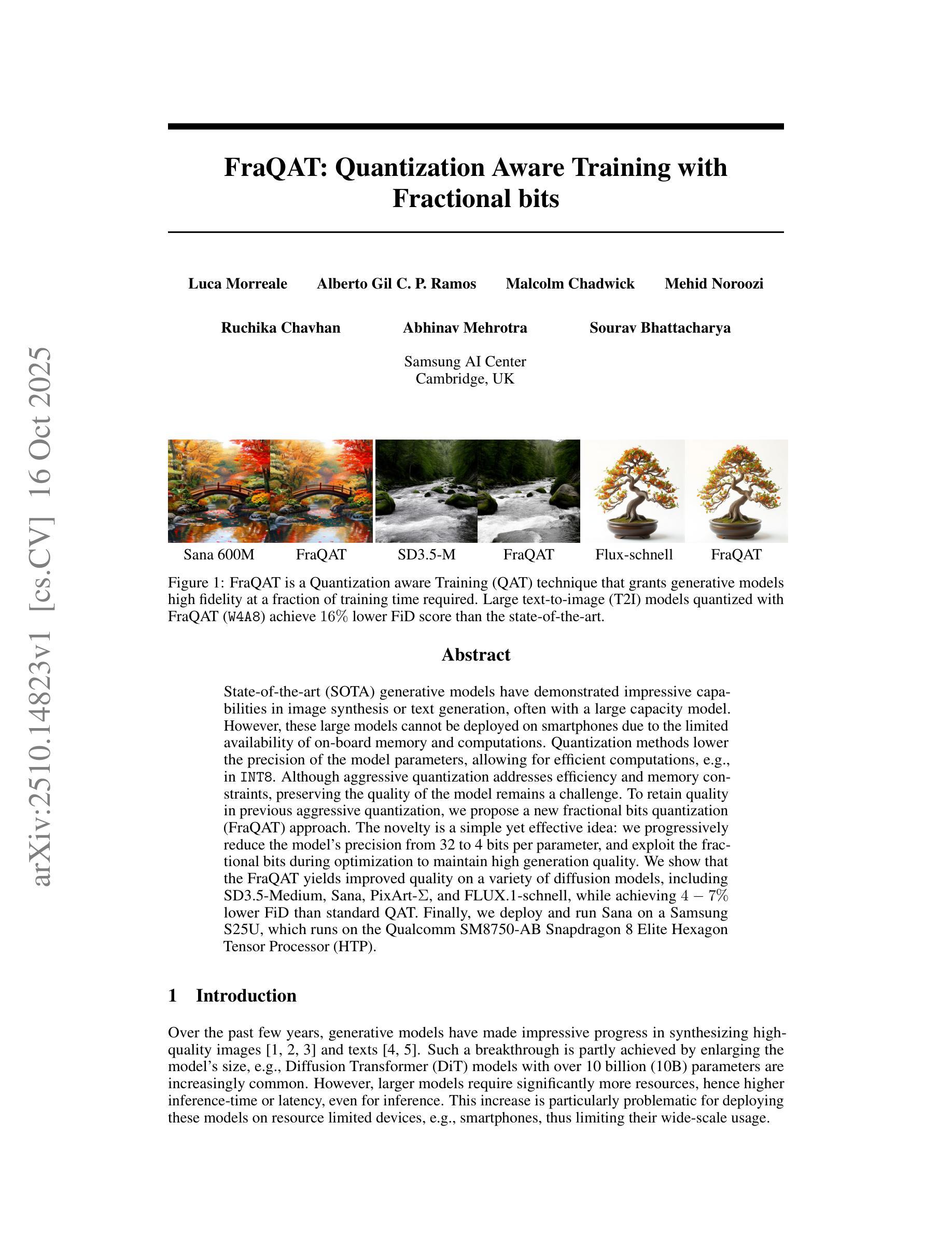 State-of-the-art (SOTA) generative models have demonstrated impressive capabilities in image synthesis or text generation, often with a large capacity model. However, these large models cannot be deployed on smartphones due to the limited availability of on-board memory and computations. Quantization methods lower the precision of the model parameters, allowing for efficient computations, \eg, in \INT{8}. Although aggressive quantization addresses efficiency and memory constraints, preserving the quality of the model remains a challenge. To retain quality in previous aggressive quantization, we propose a new fractional bits quantization (\short) approach. The novelty is a simple yet effective idea: we progressively reduce the model’s precision from 32 to 4 bits per parameter, and exploit the fractional bits during optimization to maintain high generation quality. We show that the \short{} yields improved quality on a variety of diffusion models, including SD3.5-Medium, Sana, \pixart, and FLUX.1-schnell, while achieving $4-7%$ lower FiD than standard QAT. Finally, we deploy and run Sana on a Samsung S25U, which runs on the Qualcomm SM8750-AB Snapdragon 8 Elite Hexagon Tensor Processor (HTP).