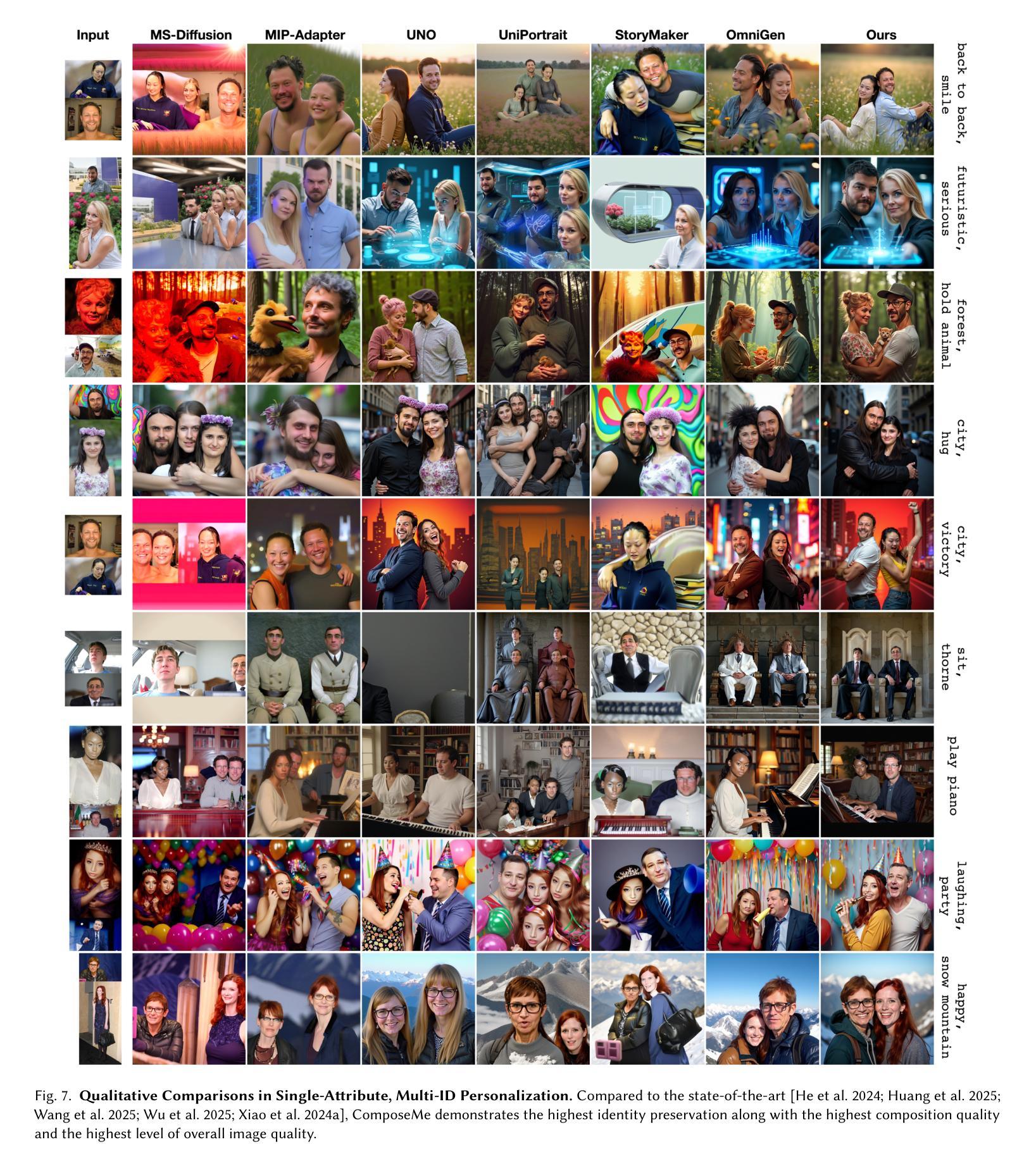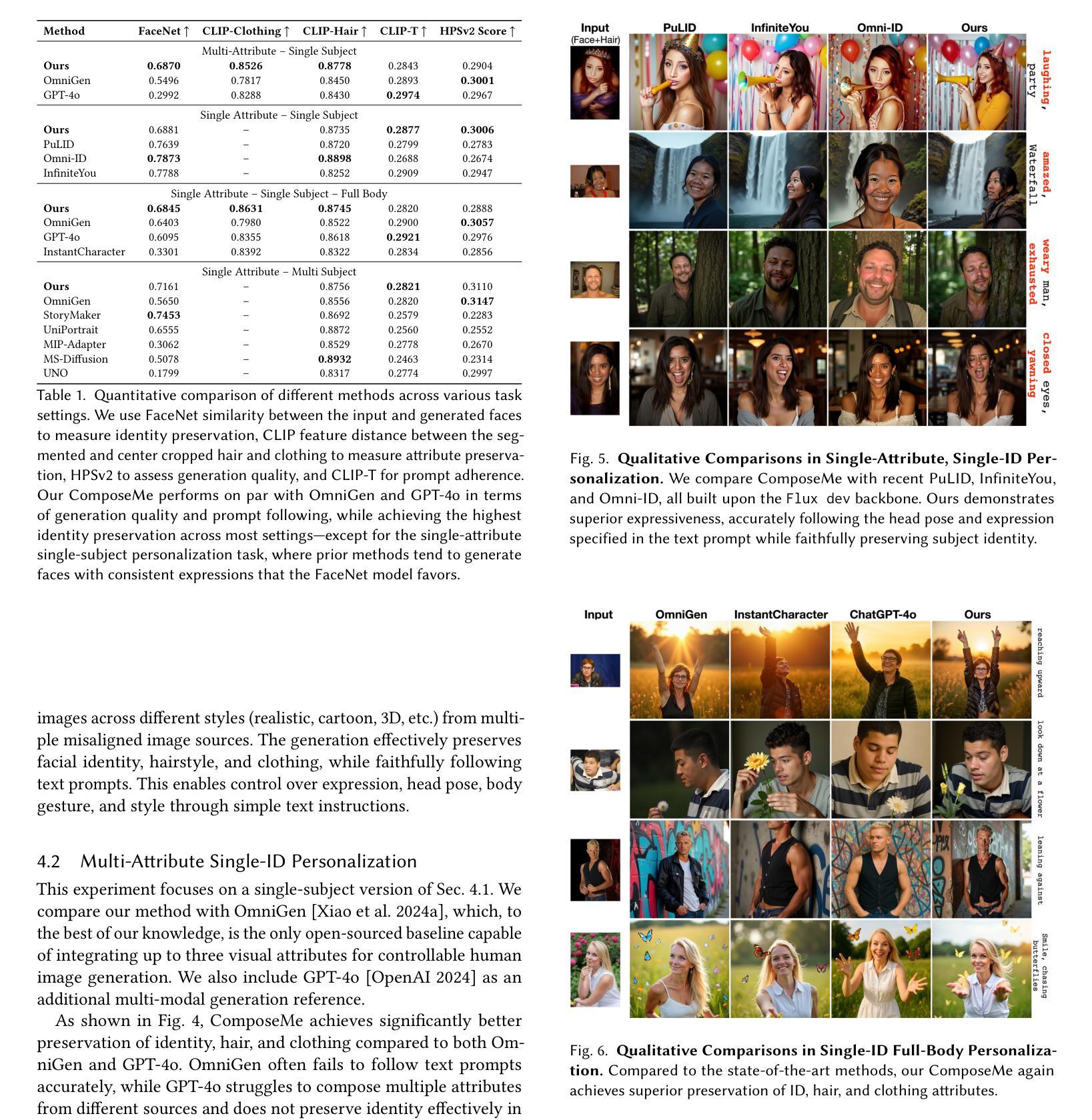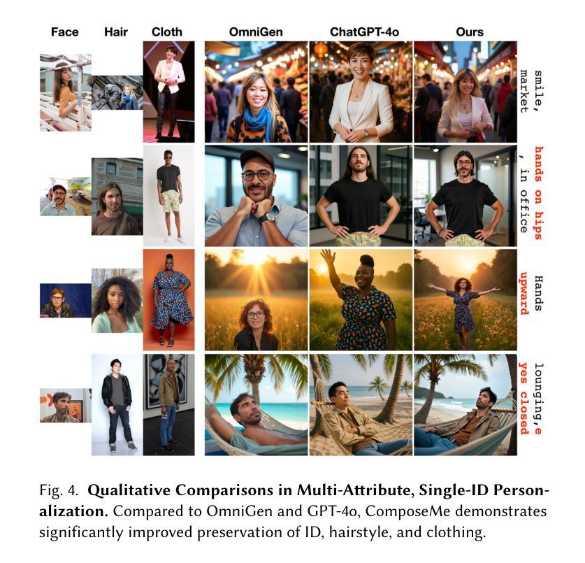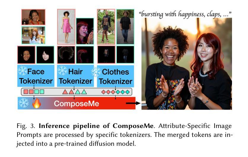 生成具有精细属性控制的高保真人类图像,如发型和服装,仍然是个性化文本到图像合成中的核心挑战。虽然之前的方法强调从参考图像中保留身份,但它们缺乏模块化,无法提供对特定视觉属性的分离控制。我们引入了一种新的属性特定图像提示范式,其中使用不同的参考图像来指导人类外观的各个方面,如头发、服装和身份。我们的方法将这些输入编码为属性特定令牌,并注入预训练的文本到图像扩散模型中。这实现了对多个视觉因素的组合和分离控制,甚至在单个图像中的多个人之间也是如此。为了促进自然的构图和稳健的分离,我们整理了一个跨参考训练数据集,其中包括不同姿势和表情的主体,并提出了一种多属性跨参考训练策略,鼓励模型在身份和文本条件的同时,从错位属性输入生成忠实输出。大量实验表明,我们的方法在准确遵循视觉和文本提示方面达到了最新性能。我们的框架通过结合视觉提示和文本驱动生成,为人像合成铺平了更加可配置的道路。网页地址为:[https://snap-research.github.io/composeme/] 。