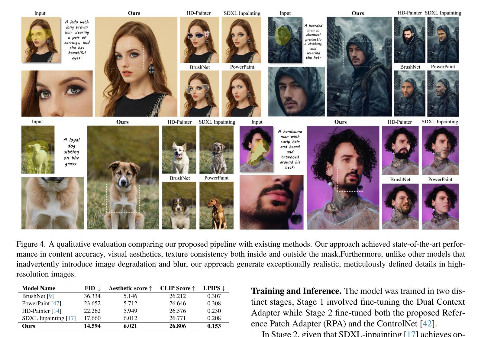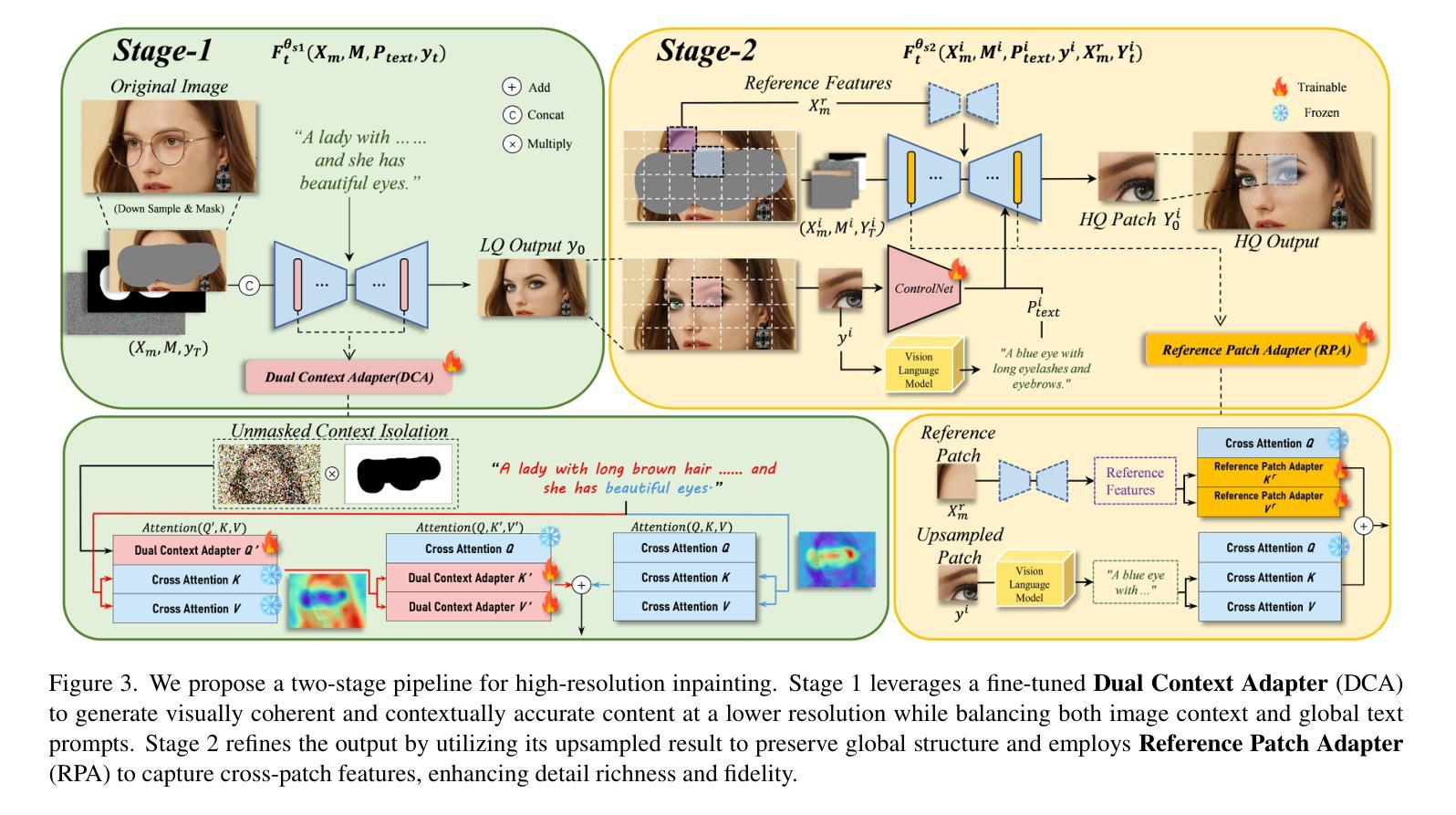 - 第二阶段是参考补丁适配器,采用补丁级别的注意力机制进行全分辨率补全,保留局部细节保真度。