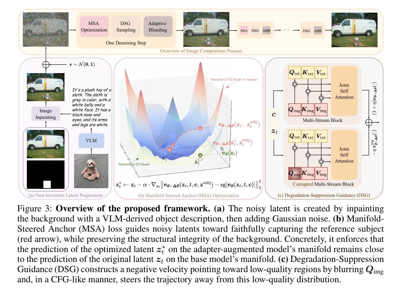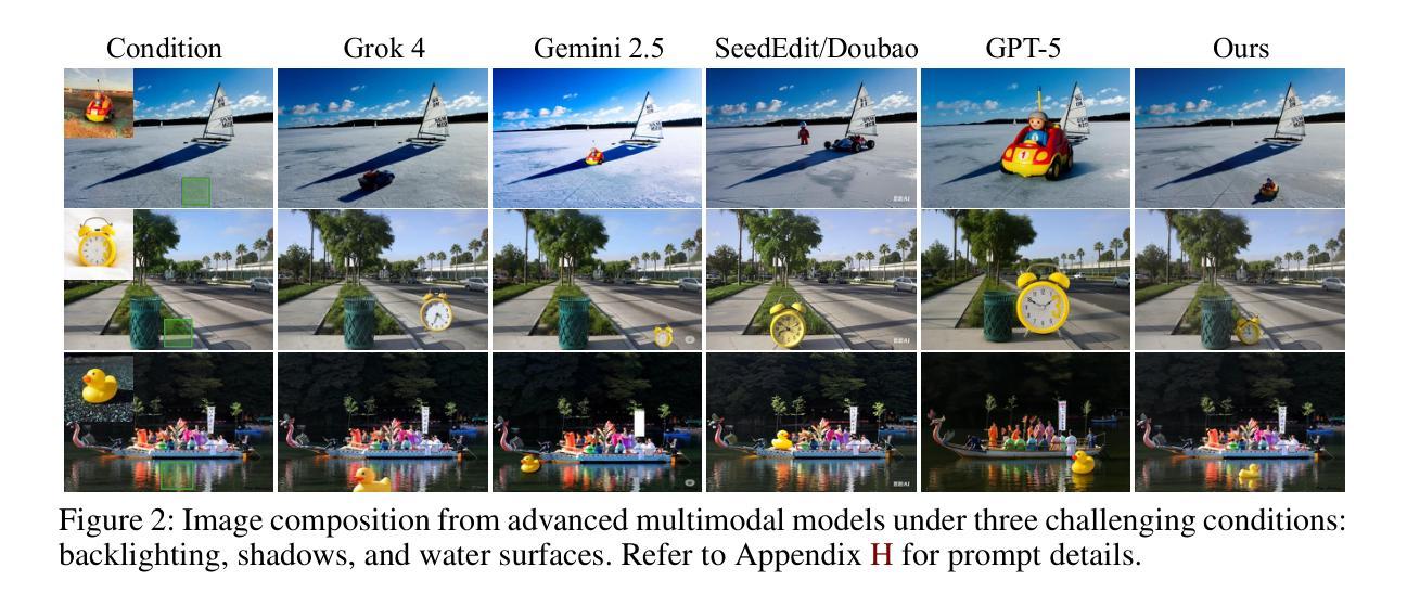 图像组合旨在无缝插入用户指定的对象到新场景中,但现有模型在处理复杂光照(例如准确阴影、水面反射)和多样化、高分辨率输入时遇到困难。现代文本到图像扩散模型(例如SD3.5、FLUX)已经编码了重要的物理和分辨率先验知识,但缺乏一个框架来释放它们,而不求助于潜在的反转,这通常会将物体的姿势锁定在上下文不适当的方向上,或脆弱的注意力手术。我们提出了SHINE,这是一个无需训练的无缝、高保真插入中性化错误框架。SHINE引入了流形引导锚点损失,利用预训练的定制适配器(例如IP-Adapter)来引导潜在表示以忠实于主题表示,同时保持背景完整性。提出退化抑制指导和自适应背景融合,以进一步消除低质量输出和可见接缝。为了解决缺乏严格基准测试的问题,我们推出了ComplexCompo,具有多种分辨率和挑战性条件,如低光照、强烈照明、复杂阴影和反射表面。在ComplexCompo和DreamEditBench上的实验表明,我们在标准指标(例如DINOv2)和人类对齐得分(例如DreamSim、ImageReward、VisionReward)上达到了最新性能。代码和基准测试将在发表时公开。