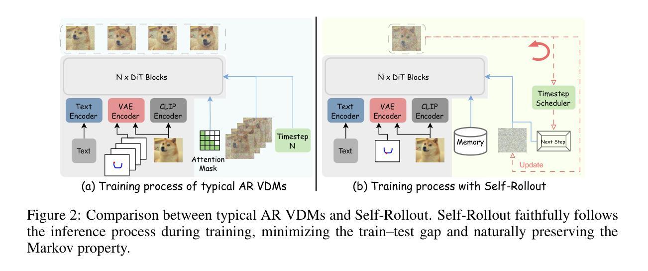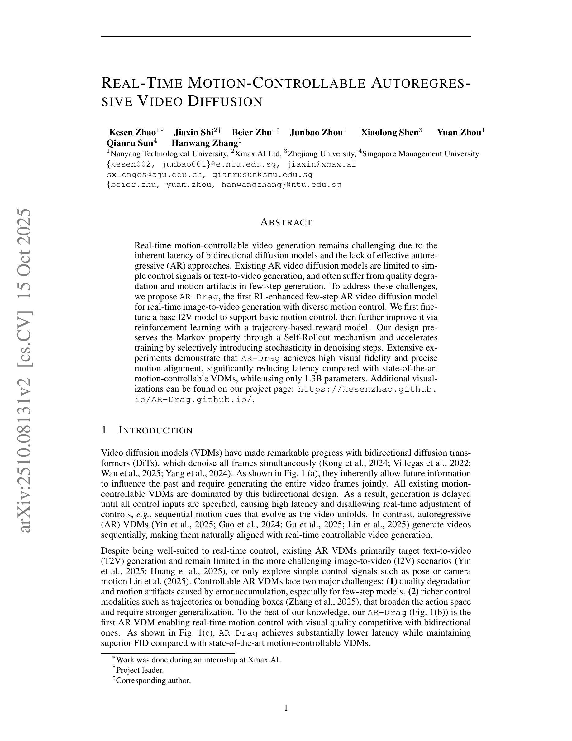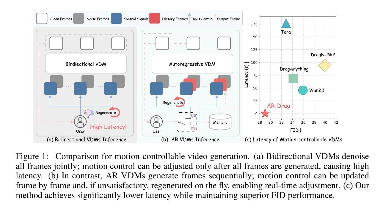 实时运动控制视频生成仍然具有挑战性,这主要是由于双向扩散模型的固有延迟和缺乏有效的自回归(AR)方法。现有的AR视频扩散模型仅限于简单的控制信号或文本到视频生成,并且在少步骤生成中经常遭受质量下降和运动伪影的问题。为了应对这些挑战,我们提出了AR-Drag,这是第一个结合强化学习的少数步骤AR视频扩散模型,用于实时图像到视频生成具有多种运动控制。我们首先微调基础I2V模型以支持基本运动控制,然后通过基于轨迹的奖励模型进一步改进。我们的设计通过自我滚动机制保留了马尔可夫属性,并通过在降噪步骤中选择性引入随机性来加速训练。大量实验表明,AR-Drag实现了高视觉保真度和精确的运动对齐,与最先进的运动控制VDM相比,延迟时间大大降低,而且仅使用1.3B参数。更多可视化内容可在我们的项目页面找到:https://kesenzhao.github.io/AR-Drag.github.io/。
