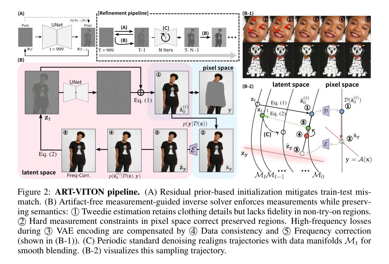本文介绍了虚拟试穿(VITON)技术面临的挑战,包括精确对准衣物、在非试穿区域保持身份和背景的真实性。虽然潜在扩散模型(LDM)提高了对准和细节合成的能力,但保留非试穿区域仍然具有挑战性。为了解决这个问题,本文提出了一种新的测量方法引导扩散框架ART-VITON,确保测量一致性并维持无瑕疵的合成效果。通过结合残差先验初始化与数据一致性、频率级校正和周期性标准去噪等方法,ART-VITON可有效保留身份和背景信息,消除边界伪影,并在视觉保真度和稳健性方面超越现有技术基线。