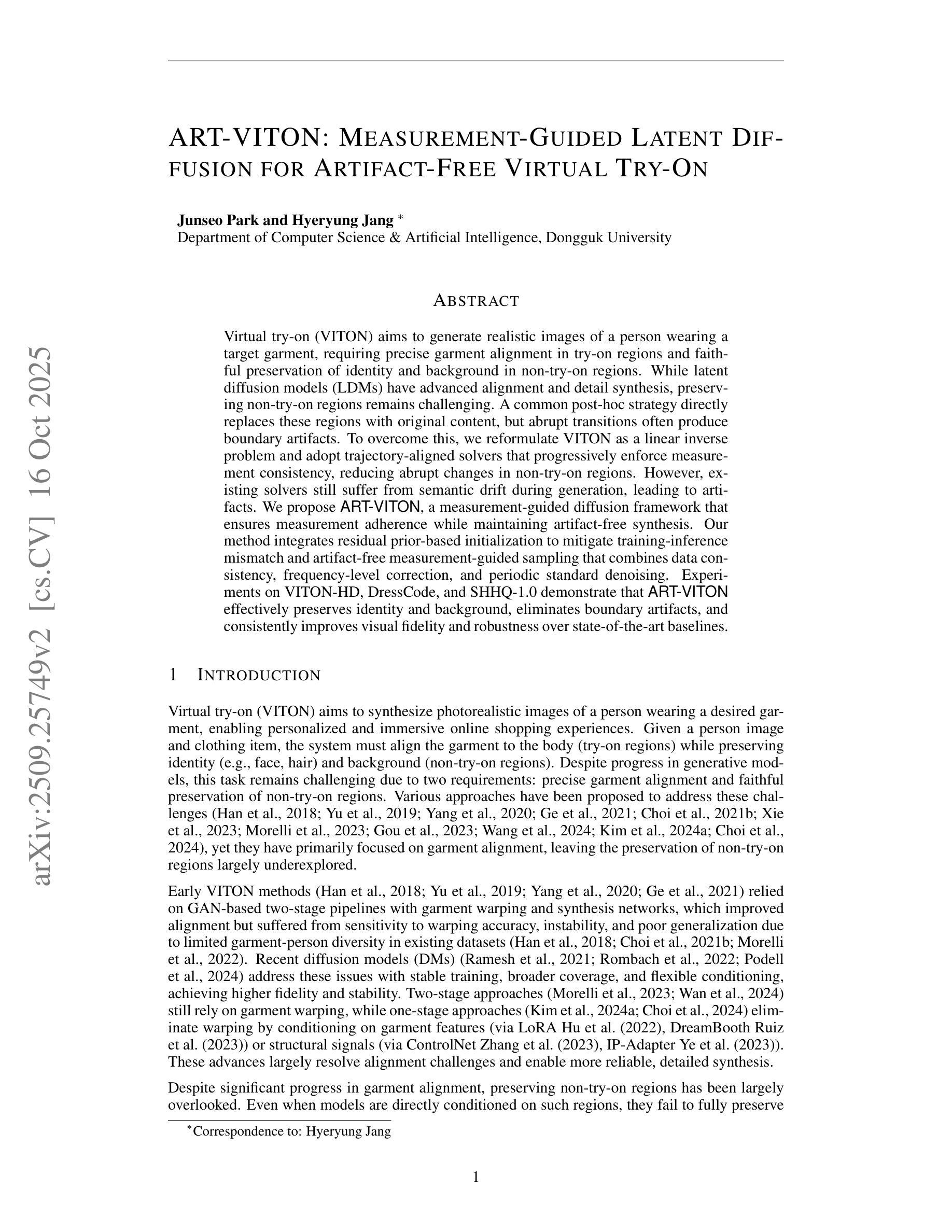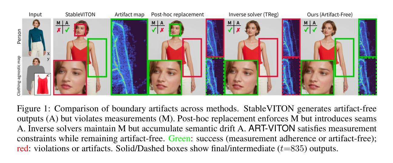 虚拟试衣(VITON)旨在生成用户穿戴目标服饰的现实图像,需要在试衣区域进行精确服饰对齐,并在非试衣区域忠实保留身份和背景。虽然潜在扩散模型(LDM)已经提高了对齐和细节合成的能力,但保留非试衣区域仍然具有挑战性。一种常见的后处理方法是直接替换这些区域以使用原始内容,但突兀的过渡通常会产生边界伪影。为了克服这一问题,我们将VITON重新表述为一个线性逆问题,并采用轨迹对齐求解器,逐步强制执行测量一致性,减少非试衣区域的突兀变化。然而,现有求解器在生成过程中仍存在语义漂移问题,导致出现伪影。我们提出了ART-VITON,一种测量指导的扩散框架,确保测量依从性同时保持无伪影合成。我们的方法集成了基于残差先验的初始化,以减轻训练推理不匹配问题,以及无伪影测量指导采样,结合了数据一致性、频率级校正和周期性标准去噪。在VITON-HD、DressCode和SHHQ-1.0上的实验表明,ART-VITON有效地保留了身份和背景,消除了边界伪影,并且相较于最先进的基线方法,在视觉保真度和稳健性方面都有了一致的提升。
