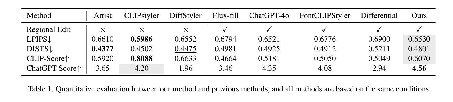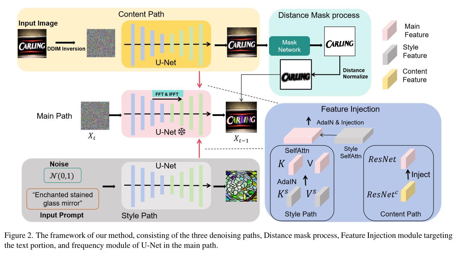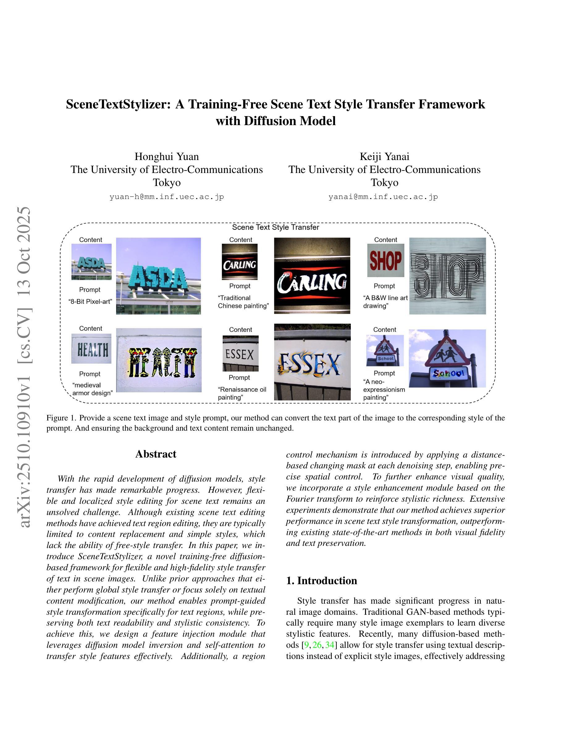 随着扩散模型的快速发展,风格转换已经取得了显著的进步。然而,场景文本的可灵活性和本地化的风格编辑仍然是一个未解决的难题。虽然现有的场景文本编辑方法已经实现了文本区域的编辑,但它们通常仅限于内容替换和简单风格,缺乏自由风格转换的能力。在本文中,我们介绍了SceneTextStylizer,这是一种无需训练的新型基于扩散的框架,用于场景图像中文本的灵活和高保真风格转换。不同于之前的全局风格转换方法或仅专注于文本内容修改的方法,我们的方法通过提示引导进行文本区域的风格转换,同时保留文本的可读性和风格的一致性。为了实现这一点,我们设计了一个特征注入模块,该模块利用扩散模型反演和自我注意来有效地转移风格特征。此外,通过每个去噪步骤中应用基于距离的变化掩膜,引入了区域控制机制,实现了精确的空间控制。为了进一步提高视觉质量,我们结合基于傅里叶变换的风格增强模块,以增强风格的丰富性。大量实验表明,我们的方法在场景文本风格转换方面达到了卓越的性能,在视觉保真度和文本保留方面都优于现有的最先进方法。