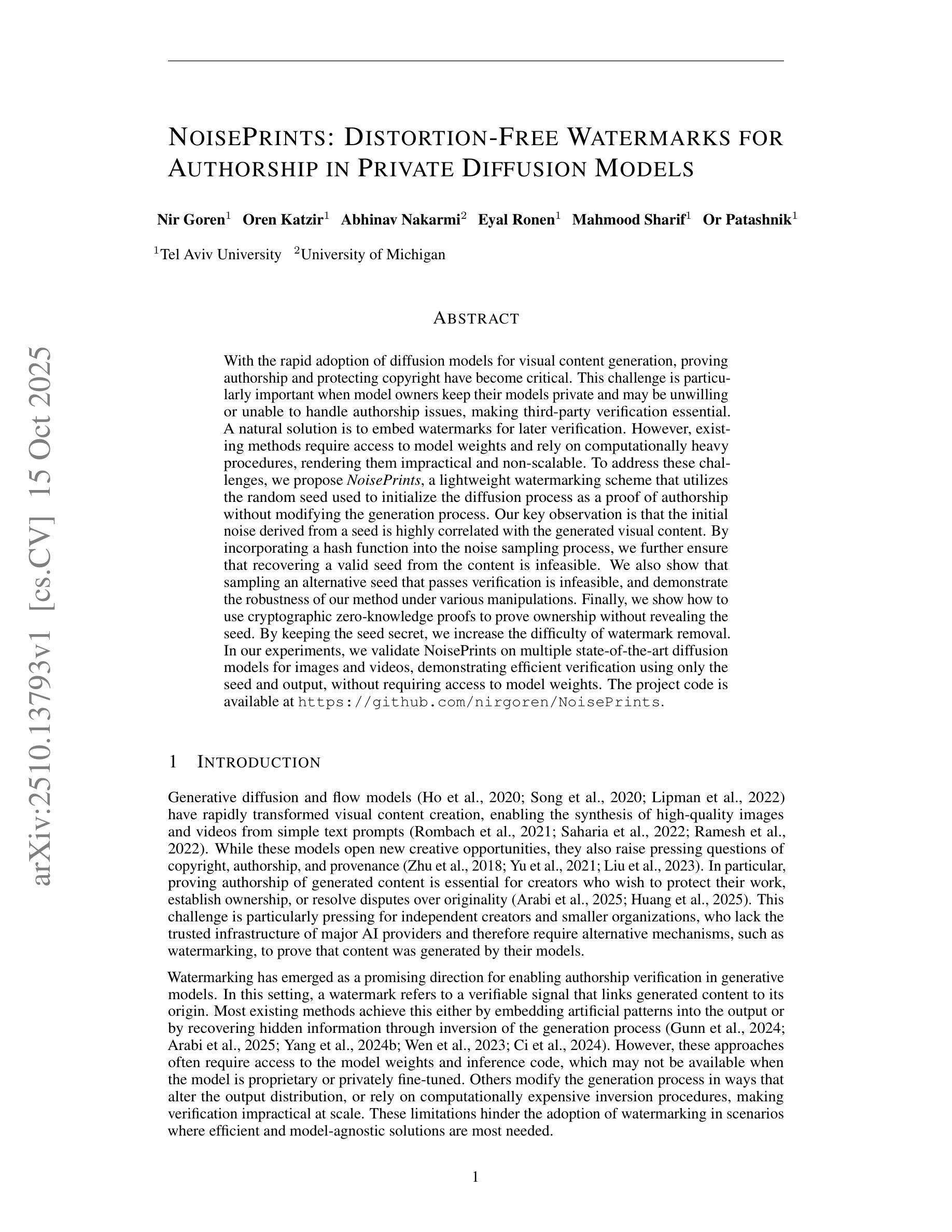 随着扩散模型在视觉内容生成领域的快速采纳,证明作者身份和保护版权变得至关重要。当模型所有者将其模型保持为私有并且可能不愿意或无法处理作者问题时,这一挑战尤为重要,这使得第三方验证变得必不可少。一种自然的解决方案是嵌入水印以供日后验证。然而,现有方法需要访问模型权重并依赖于计算密集型的程序,这使得它们不切实际且无法扩展。为了应对这些挑战,我们提出了一种轻量级的水印方案,该方案利用用于初始化扩散过程的随机种子作为作者身份的证明,而不修改生成过程。我们的关键观察结果是,从种子派生的初始噪声与生成的视觉内容高度相关。通过将哈希函数融入噪声采样过程,我们进一步确保了从内容中恢复有效的种子是不可能的。我们还展示了采样通过验证的替代种子是不可能的,并证明了我们的方法在多种操作下的稳健性。最后,我们展示了如何使用零知识证明来在不透露种子的情况下证明所有权。通过保持种子秘密,我们增加了去除水印的难度。我们在实验中在多个最先进的图像和视频扩散模型上验证了NoisePrints,证明了仅使用种子和输出进行高效验证的可能性,而无需访问模型权重。