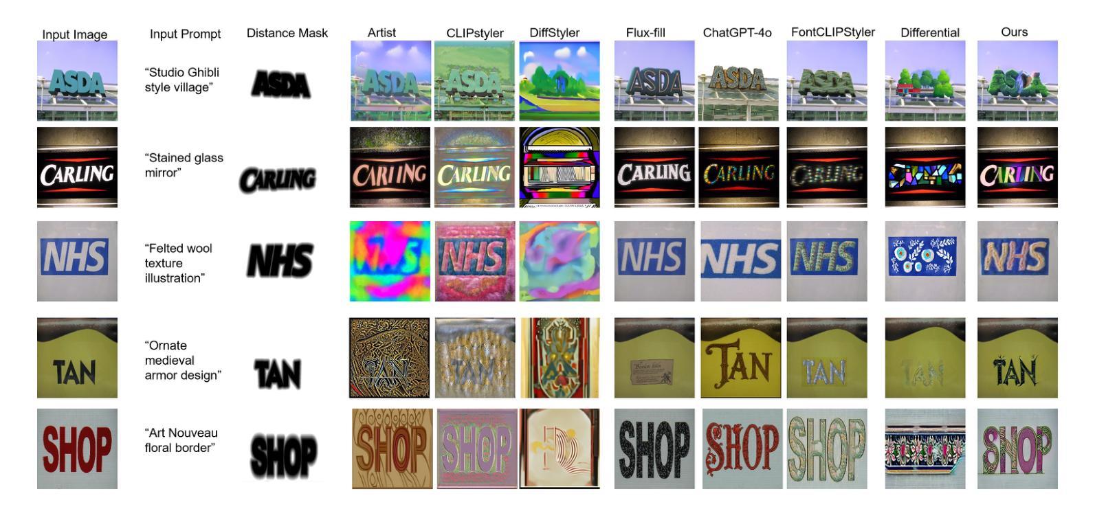 - 当前场景文本编辑方法主要局限于内容替换和简单风格,缺乏自由风格转换能力。