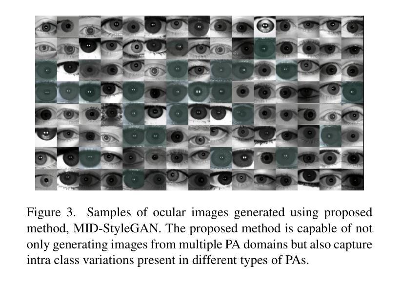 虹膜生物识别系统可能会受到呈现攻击(PAs)的威胁,其中人工眼、打印的眼图像或美容隐形眼镜等伪制品会被呈现给系统。为了对抗这一点,已经开发了几种用于检测呈现的呈现攻击检测(PAD)方法。然而,由于缺乏用于训练和评估虹膜PAD技术的数据集,这主要是因为构建和成像PAs存在隐性的困难。为了解决这个问题,我们引入了多域图像翻译扩散风格生成对抗网络(MID-StyleGAN),这是一个新的生成合成眼图像的框架,它能够捕捉多个域中的呈现攻击和真实眼特征,如真实眼、打印的眼睛和美容隐形眼镜。MID-StyleGAN结合了扩散模型和生成对抗网络(GANs)的优点,生成逼真的多样化的合成数据。我们的方法利用多域架构,实现真实眼图像和不同呈现攻击域之间的翻译。模型采用适合眼数据的自适应损失函数,以保持域一致性。大量实验表明,MID-StyleGAN在生成高质量合成眼图像方面优于现有方法。生成的数据被用来显著提高PAD系统的性能,为解决虹膜和眼部生物识别中的数短缺问题提供了可扩展的解决方案。例如,在LivDet2020数据集上,在千分之一的误检率下,真实检测率从93.41%提高到98.72%,展示了所提出方法的影响。