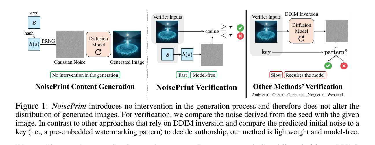 - NoisePrints利用扩散过程初始化时的随机种子作为作者证明,无需修改生成过程。