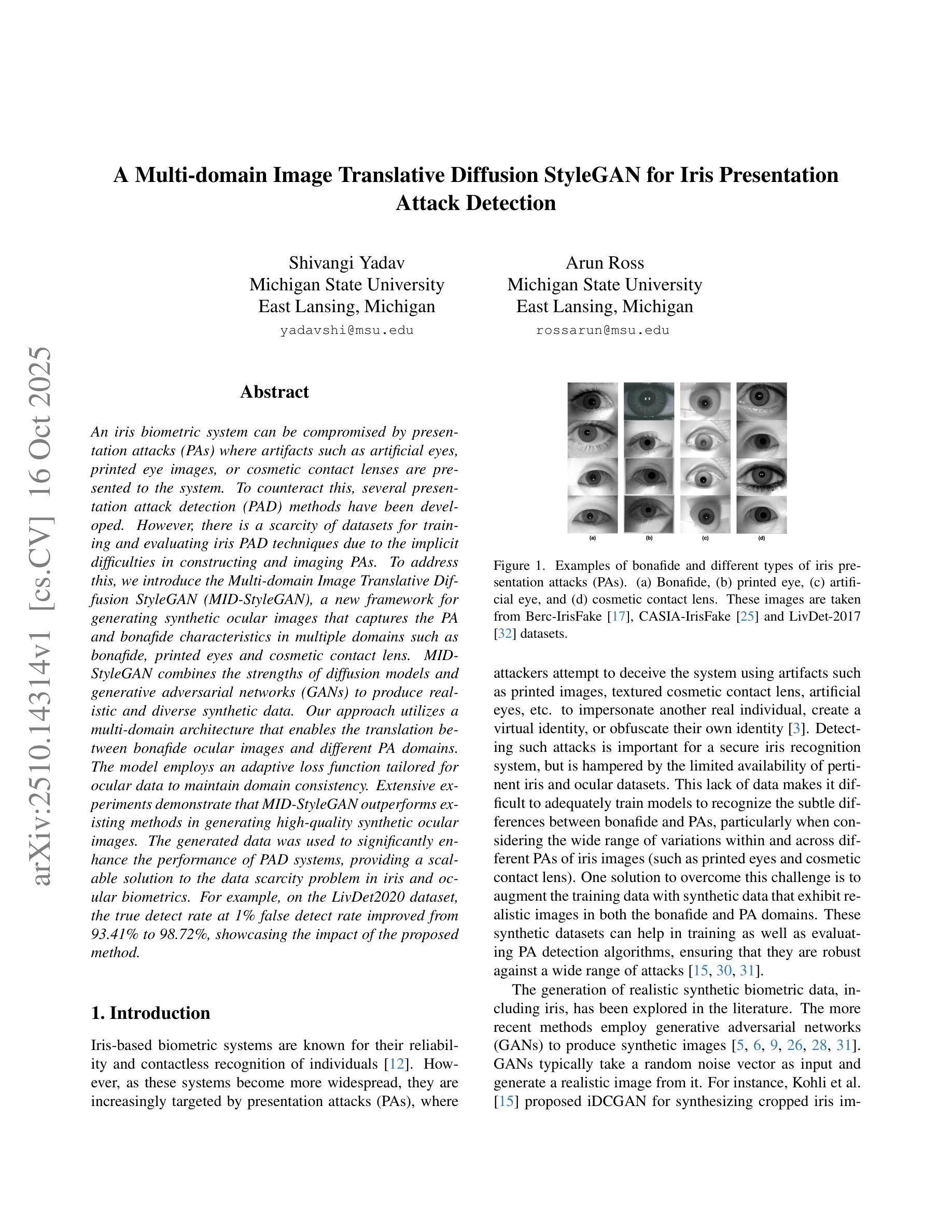 An iris biometric system can be compromised by presentation attacks (PAs) where artifacts such as artificial eyes, printed eye images, or cosmetic contact lenses are presented to the system. To counteract this, several presentation attack detection (PAD) methods have been developed. However, there is a scarcity of datasets for training and evaluating iris PAD techniques due to the implicit difficulties in constructing and imaging PAs. To address this, we introduce the Multi-domain Image Translative Diffusion StyleGAN (MID-StyleGAN), a new framework for generating synthetic ocular images that captures the PA and bonafide characteristics in multiple domains such as bonafide, printed eyes and cosmetic contact lens. MID-StyleGAN combines the strengths of diffusion models and generative adversarial networks (GANs) to produce realistic and diverse synthetic data. Our approach utilizes a multi-domain architecture that enables the translation between bonafide ocular images and different PA domains. The model employs an adaptive loss function tailored for ocular data to maintain domain consistency. Extensive experiments demonstrate that MID-StyleGAN outperforms existing methods in generating high-quality synthetic ocular images. The generated data was used to significantly enhance the performance of PAD systems, providing a scalable solution to the data scarcity problem in iris and ocular biometrics. For example, on the LivDet2020 dataset, the true detect rate at 1% false detect rate improved from 93.41% to 98.72%, showcasing the impact of the proposed method.