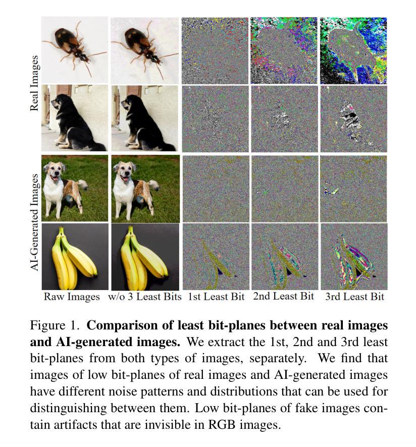 近期GAN和Diffusion模型的发展使得区分AI生成图像和真实图像变得困难。传统方法主要依赖图像重建误差来判断图像是否由AI生成,但计算成本高且忽略图像本身的噪声特征。为此,我们采用基于位平面的图像处理方法进行误差提取,并利用各种图像归一化策略。此外,设计最大梯度补丁选择来放大噪声信号,进而提出轻量级有效的分类头。在GenImage基准测试上,我们的方法表现出卓越性能,平均准确率高达98.9%,且跨生成器泛化能力强。此外,我们的方法执行误差提取的速度接近毫秒级别,是现有方法的近百倍。