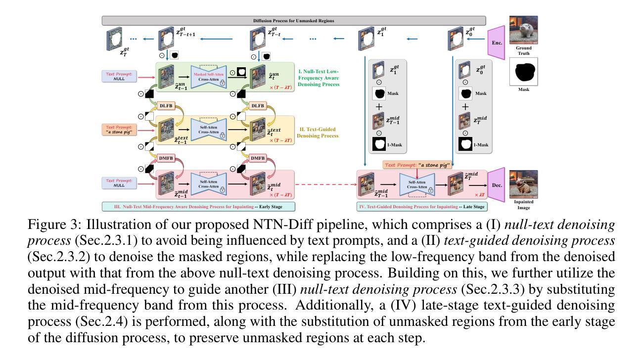 文本引导的图像修复旨在根据文本提示重建掩码区域,长期以来的挑战在于保持未掩码区域的完整性,同时实现未掩码和修复掩码区域之间的语义一致性。以前的方法未能同时解决这两个问题,通常只能解决其中之一。我们观察到,这种情况源于混合(例如中低频)频带纠缠,这些频带编码了不同的图像属性,在去噪过程中对文本提示的敏感性不同。在本文中,我们提出了一种用于文本引导的图像修复的零文本零频率感知扩散模型,称为NTN-Diff。它通过分解掩码和未掩码区域之间的语义一致性,针对每个频带保持未掩码区域的完整性,以克服这两个挑战。基于扩散过程,我们将去噪过程进一步分为早期(高级噪声)和晚期(低级噪声)阶段,其中在去噪过程中解开中低频带。观察到稳定的中频带在文本引导的去噪过程中逐步降噪以实现语义对齐,同时作为零文本去噪过程的指导来降噪低频带在掩码区域。随后在晚期阶段进行后续文本引导的去噪过程,以实现掩码和未掩码区域之间的中低频带的语义一致性,同时保持未掩码区域的完整性。大量实验验证了NTN-Diff在文本引导扩散模型方面的优越性超过了当前最先进的扩散模型。我们的代码可从https://github.com/htyjers/NTN-Diff访问。
