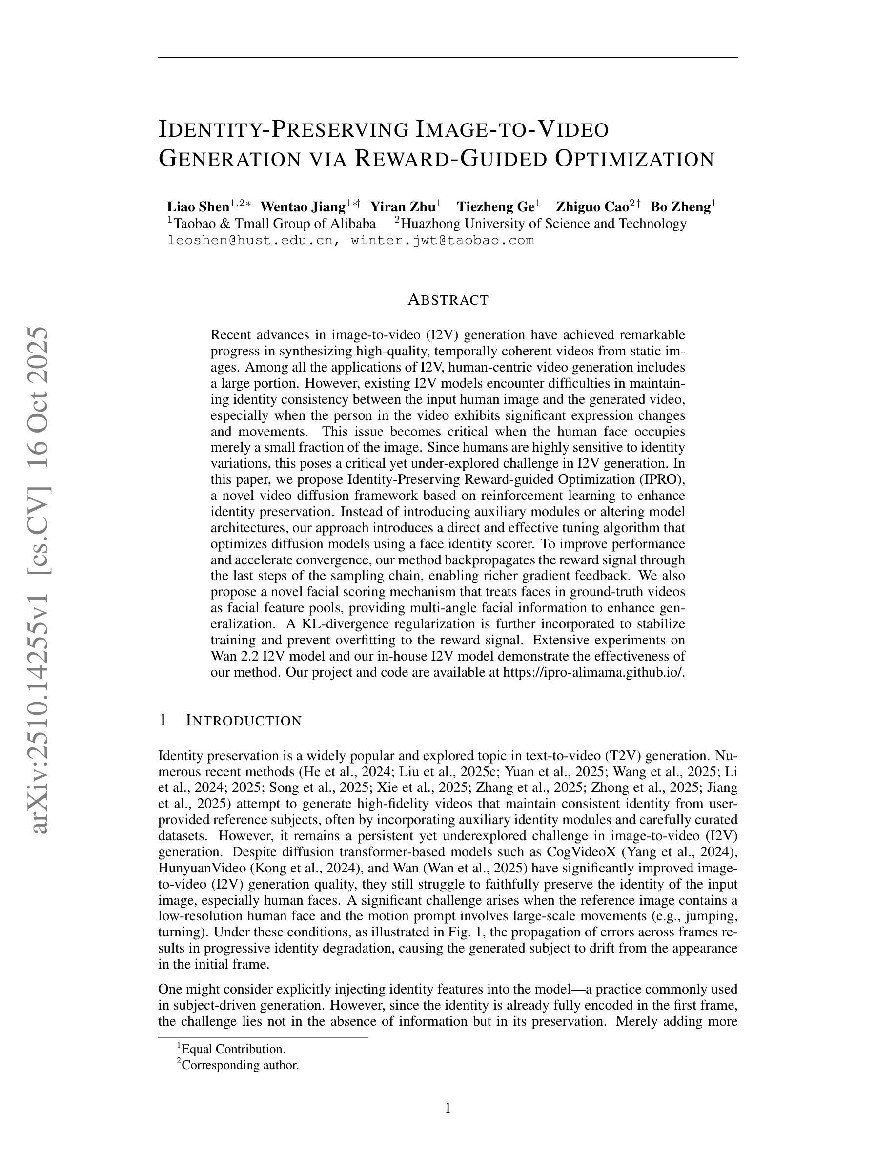 近期图像到视频(I2V)生成的进展在从未静态图像合成高质量、时间连贯的视频方面取得了显著成效。在所有的I2V应用中,以人类为中心的视频生成占据很大一部分。然而,现有的I2V模型在保持输入人像与生成视频之间身份一致性方面遇到困难,特别是在视频中人物表情变化和动作显著时。当人脸只占图像的一小部分时,这个问题变得更为关键。由于人类对身份变化高度敏感,这为I2V生成提出了一个至关重要但尚未被充分研究的挑战。在本文中,我们提出了基于强化学习的身份保留奖励引导优化(IPRO)新型视频扩散框架,以提升身份保留能力。我们的方法不是引入辅助模块或改变模型架构,而是引入了一种直接有效的调整算法,该算法使用面部身份评分者对扩散模型进行优化。为了提升性能和加速收敛,我们的方法通过采样链的最后几步反向传播奖励信号,从而实现更丰富的梯度反馈。我们还提出了一种新型的面部评分机制,将真实视频中的面部视为面部特征池,提供多角度的面部信息以增强泛化能力。进一步引入了KL散度正则化以稳定训练并防止对奖励信号的过度拟合。在Wan 2.2 I2V模型和我们的内部I2V模型上的大量实验证明了我们的方法的有效性。我们的项目和代码可在https://ipro-alimama.github.io/访问。