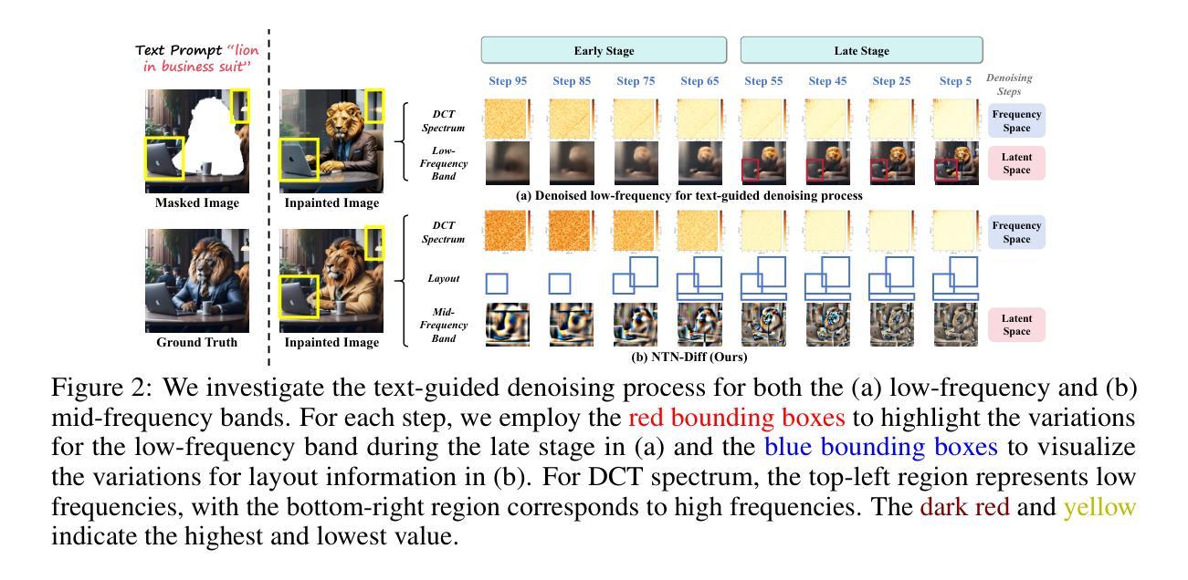 本文提出一种名为NTN-Diff的频率感知扩散模型,用于文本引导的图像修复。该模型通过分解掩码区域和非掩码区域之间的语义一致性,针对每个频率范围进行一致性的训练,以此解决掩码区域的重建和非掩码区域的保留两个挑战。模型在降噪过程中将图像分为早期和晚期两个阶段,通过文本引导降噪处理中频区域,以实现对非掩码区域的指导并保持一致性。最终实现了与最新扩散模型相比更为优越的文本引导图像修复性能。有关代码可访问链接:[访问链接]。