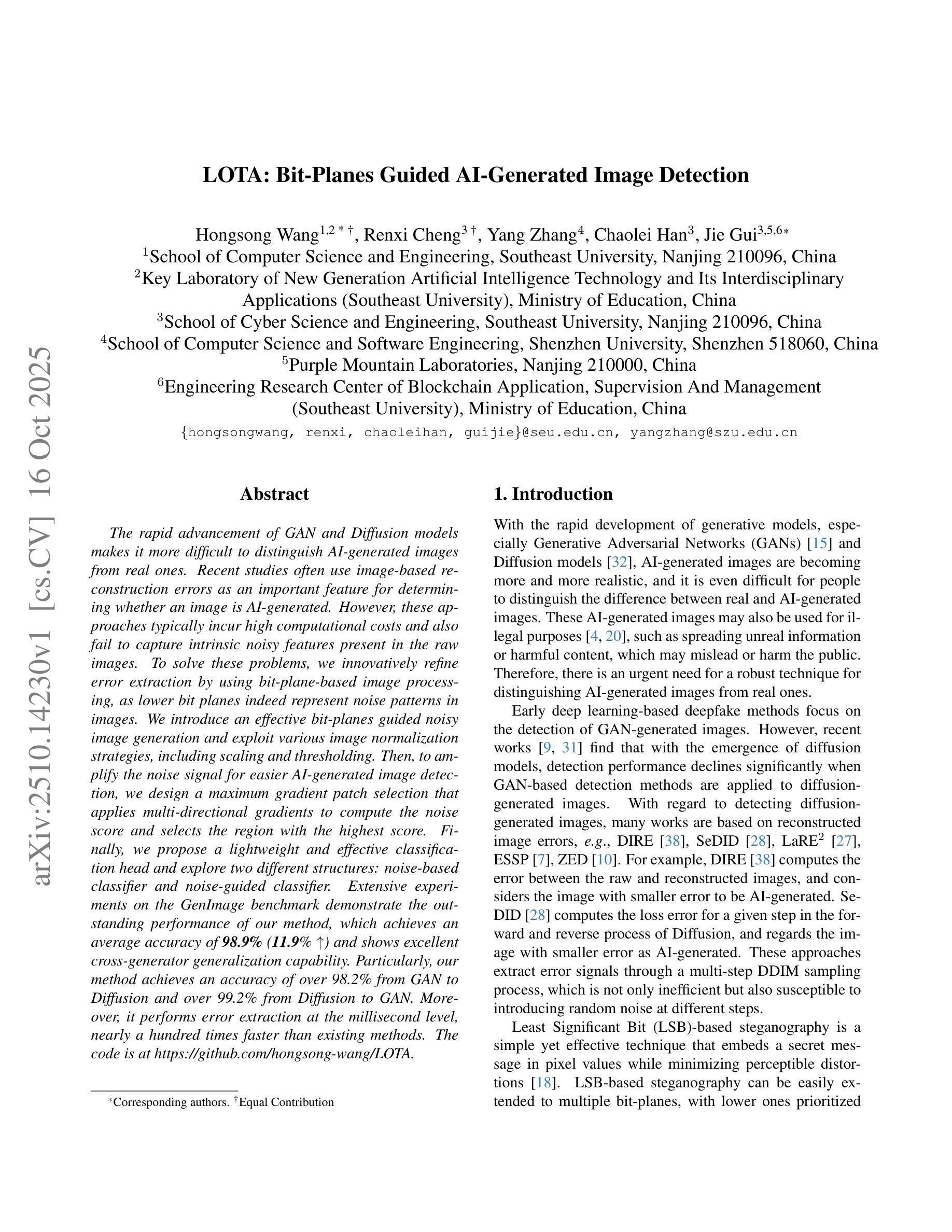 GAN和Diffusion模型的快速发展使得区分AI生成的图像和真实图像变得更加困难。近期的研究经常将基于图像的重建误差作为判断图像是否由AI生成的重要特征。然而,这些方法通常会导致较高的计算成本,并且无法捕捉到原始图像中存在的内在噪声特征。为了解决这些问题,我们创新性地通过基于位平面的图像处理来改进误差提取,因为低位平面确实代表了图像中的噪声模式。我们引入了一种有效的位平面引导噪声图像生成方法,并利用了各种图像归一化策略,包括缩放和阈值化。接着,为了放大噪声信号,便于检测AI生成的图像,我们设计了一种最大梯度补丁选择方法,该方法应用多方向梯度来计算噪声分数,并选择得分最高的区域。最后,我们提出了一种轻便有效的分类头,并探索了两种不同结构:基于噪声的分类器和噪声引导的分类器。在GenImage基准测试上的广泛实验证明了我们方法的出色性能,该方法达到了平均准确率98.9%(上升11.9%),并表现出出色的跨生成器泛化能力。特别是,我们的方法从GAN到Diffusion的准确率超过98.2%,而从Diffusion到GAN的准确率超过99.2%。此外,它以毫秒级的速度进行误差提取,几乎是现有方法的100倍。代码地址为:https://github.com/hongsong-wang/LOTA。