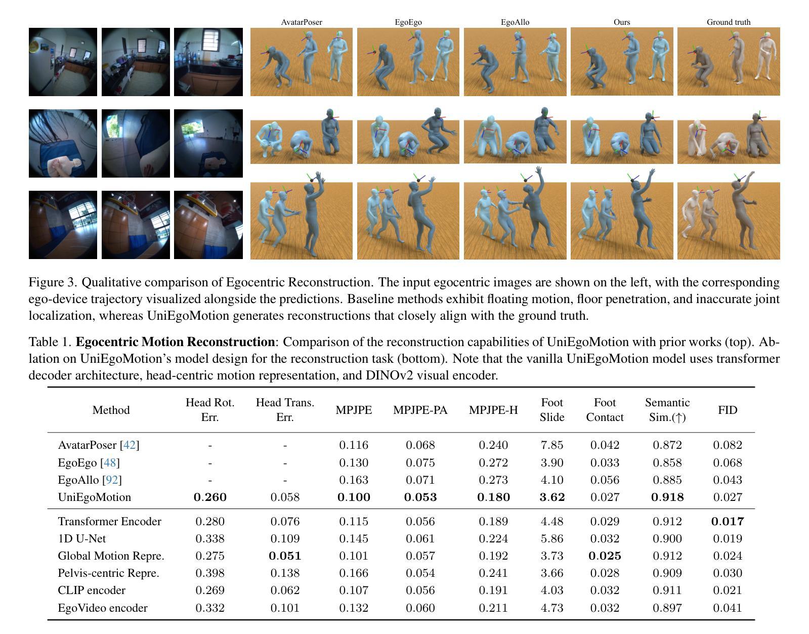 本文介绍了以自我为中心的动态运动生成与预测的重要性,并指出其在增强AR/VR体验、改善人机互动、推进辅助技术和自适应医疗解决方案等领域的应用。针对现有方法主要关注第三人称运动合成与结构化3D场景上下文的问题,本文提出了以第一人称图像为基础的无依赖显式3D场景的Egocentric Motion Generation和Egocentric Motion Forecasting两个新任务。同时,介绍了一种统一条件运动扩散模型UniEgoMotion,该模型具有针对以自我为中心的设备的新型头中心运动表示。UniEgoMotion的简单而有效的设计支持以自我为中心的运动重建、预测和生成,在一个统一框架内从第一人称视觉输入中进行处理。与忽视场景语义的先前工作不同,我们的模型能够有效地提取基于图像的场景上下文来推断合理的3D运动。为了促进训练,我们还引入了从EgoExo4D派生的EE4D-Motion大规模数据集,该数据集增强了伪地面真实3D运动注释。UniEgoMotion在自我为中心的运动重建方面取得了最先进的性能表现,并且是首个能够从单一自我为中心图像生成运动的模型。