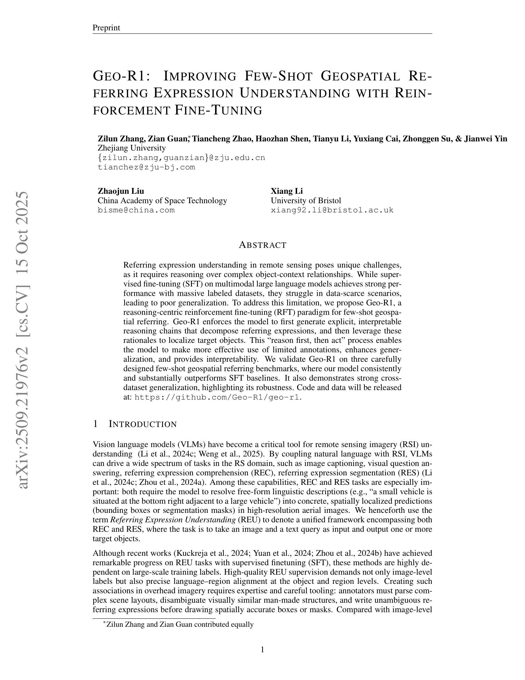 远程感知中的指代表达式理解面临独特挑战,需要推理复杂对象上下文关系。虽然监督微调(SFT)在多模态大型语言模型上应用时,在大量标记数据集上表现出强大性能,但在数据稀缺场景中却表现不佳,导致泛化能力有限。为解决这一问题,我们提出Geo-R1,一种针对少数地理空间指代的推理中心强化微调(RFT)范式。Geo-R1强制模型首先生成明确、可解释的推理链,分解指代表达式,然后利用这些理性来定位目标对象。这种“先推理,后行动”的过程使模型更有效地利用有限注释,增强了泛化能力,并提供了可解释性。我们在三个精心设计的少数地理空间指代基准测试上验证了Geo-R1,我们的模型始终且大幅度优于SFT基准测试。它还展示了强大的跨数据集泛化能力,凸显了其稳健性。