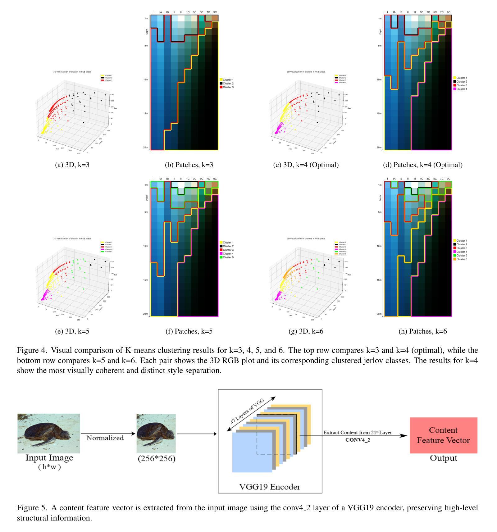 本文提出了一种新型框架,即解纠缠风格内容GAN(DISC-GAN),它将风格内容解纠缠与针对特定集群的训练策略相结合,以实现逼真的水下图像合成。由于颜色衰减和浑浊等现象,合成水下图像的质量面临光学挑战。这些现象表现为不同水体之间独特的风格变化,例如色调和雾霾的变化。虽然生成模型非常适合捕捉复杂模式,但它们往往缺乏对不同水下环境非均匀条件的建模能力。为了解决这些挑战,我们采用K-means聚类将数据集划分为特定风格的领域。我们使用单独的编码器获取风格和内容的潜在空间;我们通过自适应实例归一化(AdaIN)进一步整合这些潜在表示,并解码结果以产生最终的合成图像。该模型是在每个风格集群上独立训练的,以保留特定领域的特征。我们的框架展示了最先进的性能,获得了结构相似性指数(SSIM)为0.9012、平均峰值信噪比(PSNR)为32.5118分贝和弗雷歇特入口距离(FID)为13.3728的成果。