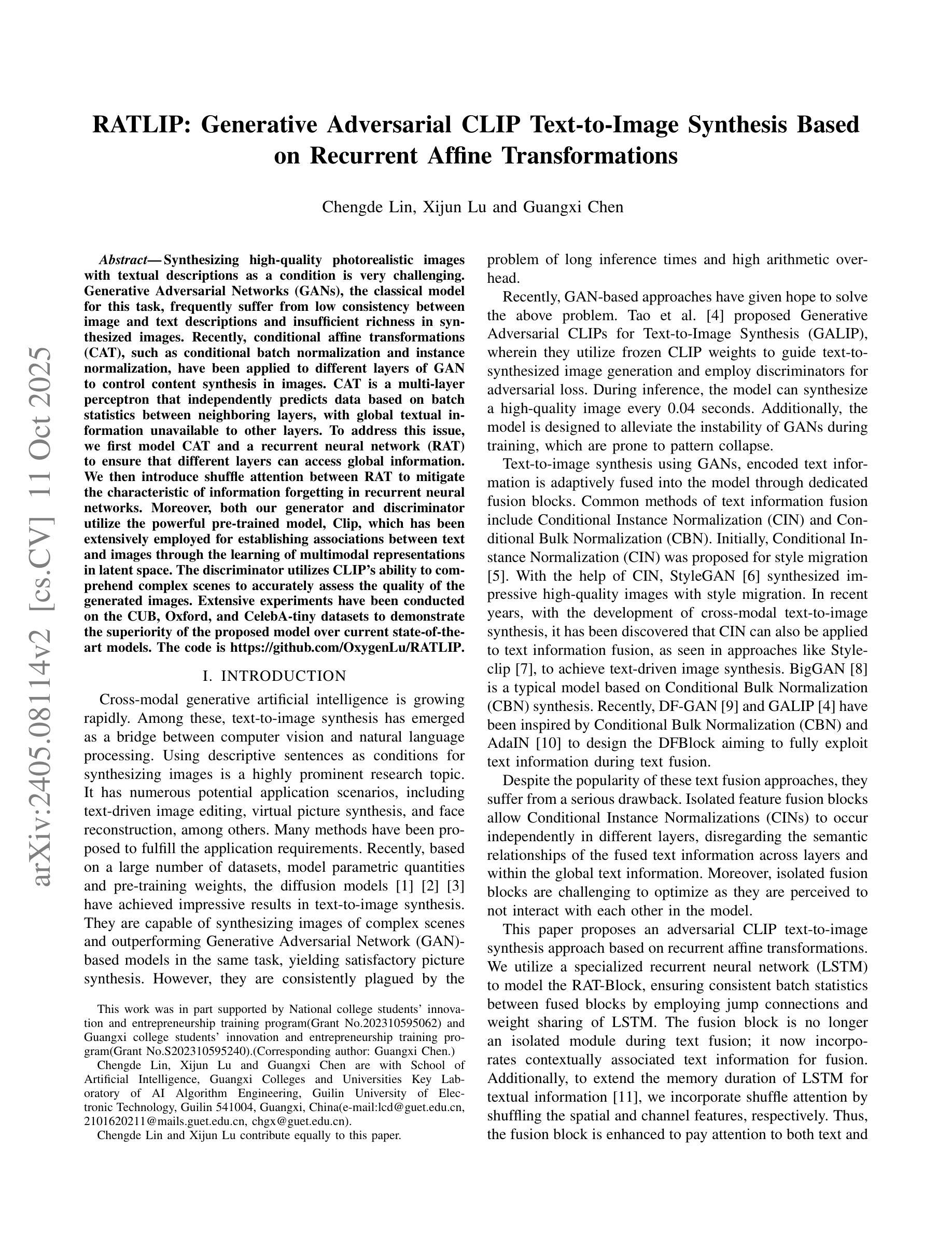 将文本描述作为条件合成高质量的照片级图像是一项非常具有挑战性的任务。生成对抗网络(GANs)是这项任务的经典模型,但它们在图像和文本描述之间的一致性较低,且合成图像的丰富性不足。最近,条件仿射变换(CAT,如条件批量归一化和实例归一化)已应用于GAN的不同层,以控制图像中的内容合成。CAT是一种多层感知器,它基于相邻层之间的批量统计数据独立预测数据,而其他层无法获取全局文本信息。为了解决这一问题,我们首先建立CAT和循环神经网络(RAT)模型,以确保不同层可以访问全局信息。然后,我们在RAT之间引入shuffle注意力,以减轻循环神经网络中信息遗忘的特征。此外,我们的生成器和判别器都使用强大的预训练模型Clip。Clip已被广泛用于通过建立潜在空间中的多模式表示来建立文本和图像之间的关联。判别器利用CLIP理解复杂场景的能力来准确评估生成图像的质量。在CUB、Oxford和CelebA-tiny数据集上进行了大量实验,以证明所提出的模型优于当前最先进的模型。代码地址为:https://github.com/OxygenLu/RATLIP。
