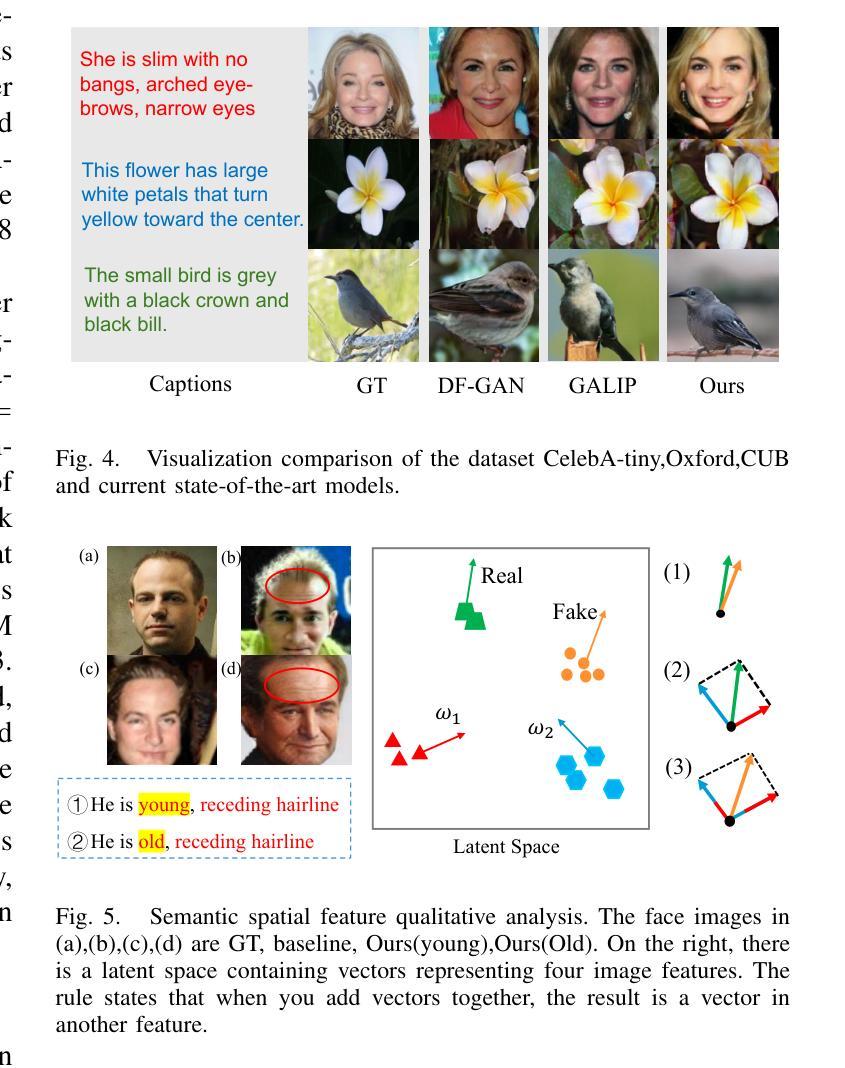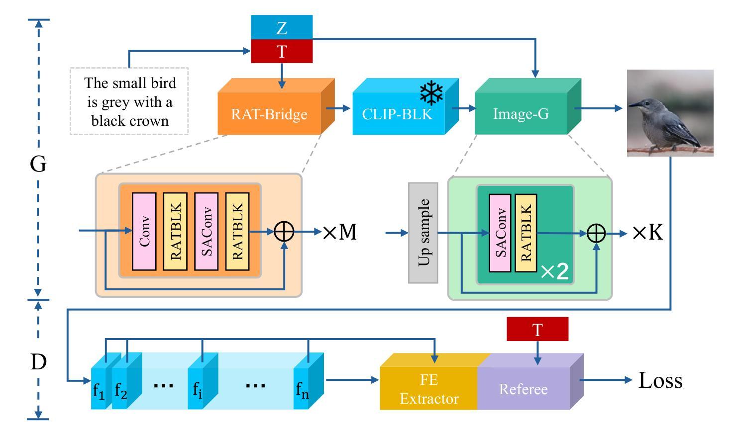 利用生成对抗性网络(GANs)合成高质量逼真的图像并以文本描述作为条件是一项挑战。最近,条件仿射变换(CAT)被应用于GAN的不同层以控制图像内容的合成。为解决不同层无法访问全局信息的问题,提出了结合条件仿射变换和循环神经网络(RAT)的模型,并引入shuffle attention来缓解循环神经网络中信息遗忘的特征。同时,生成器和判别器都利用强大的预训练模型Clip,通过潜在空间中的多模态表示学习来建立文本和图像之间的联系。判别器利用CLIP理解复杂场景的能力来准确评估生成图像的质量。在CUB、Oxford和CelebA-tiny数据集上进行的实验表明,该模型优于当前最先进的模型。