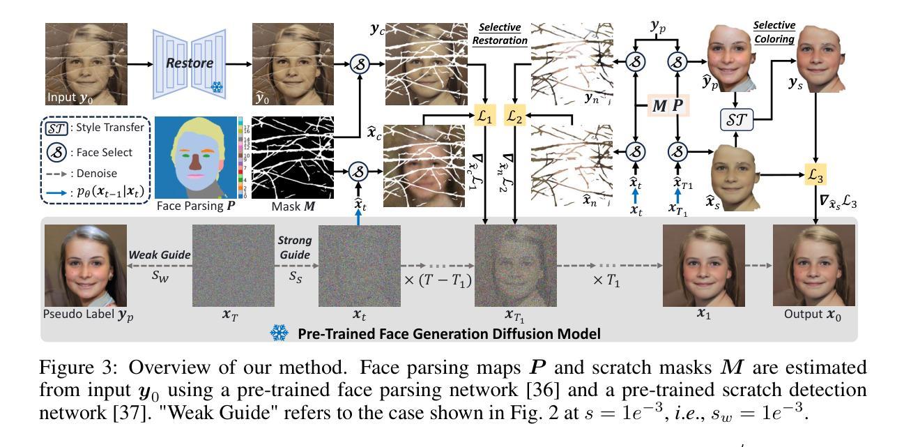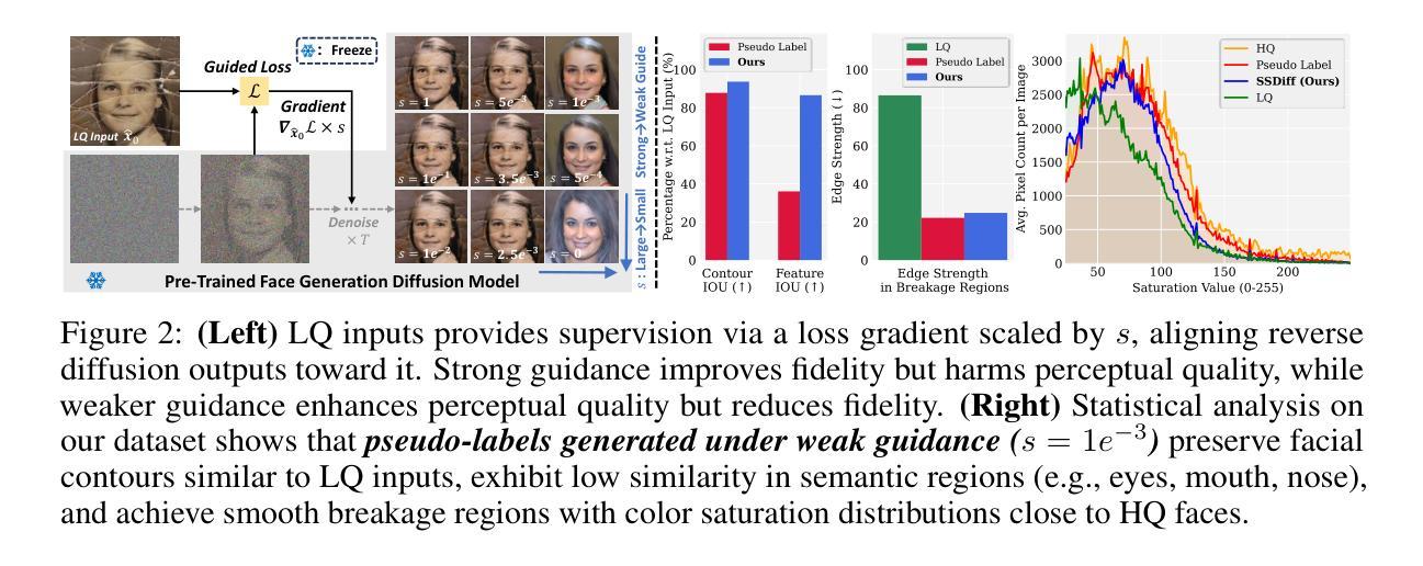 本文介绍了老照片人脸修复的挑战,包括断裂、褪色和严重模糊等问题。现有的预训练扩散引导方法存在局限性,如依赖明确的退化先验或全局统计指导,难以处理局部伪影或人脸颜色问题。本文提出一种自监督选择性引导扩散(SSDiff)方法,利用弱引导下预训练扩散模型生成的人脸伪参考图像。伪标签具有结构对齐的轮廓和自然颜色,通过分阶段监督实现特定区域修复:去噪过程中应用结构指导,后期步骤进行颜色优化,与扩散的由粗到细特性相符。结合人脸解析图和划痕掩膜,该方法能选择性恢复断裂区域,同时避免身份不匹配。此外,还构建了VintageFace数据集,包含300张不同退化程度的老照片人脸图像。SSDiff在感知质量、保真度和区域可控性方面优于现有的基于GAN和扩散的方法。