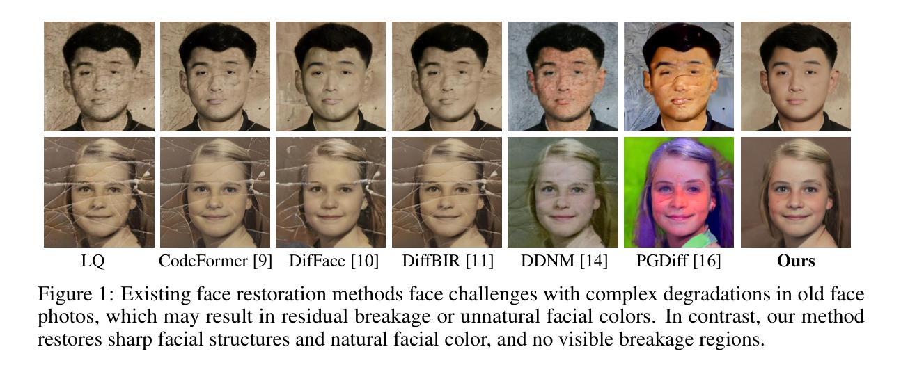 - 老照片人脸修复面临断裂、褪色和模糊等挑战。