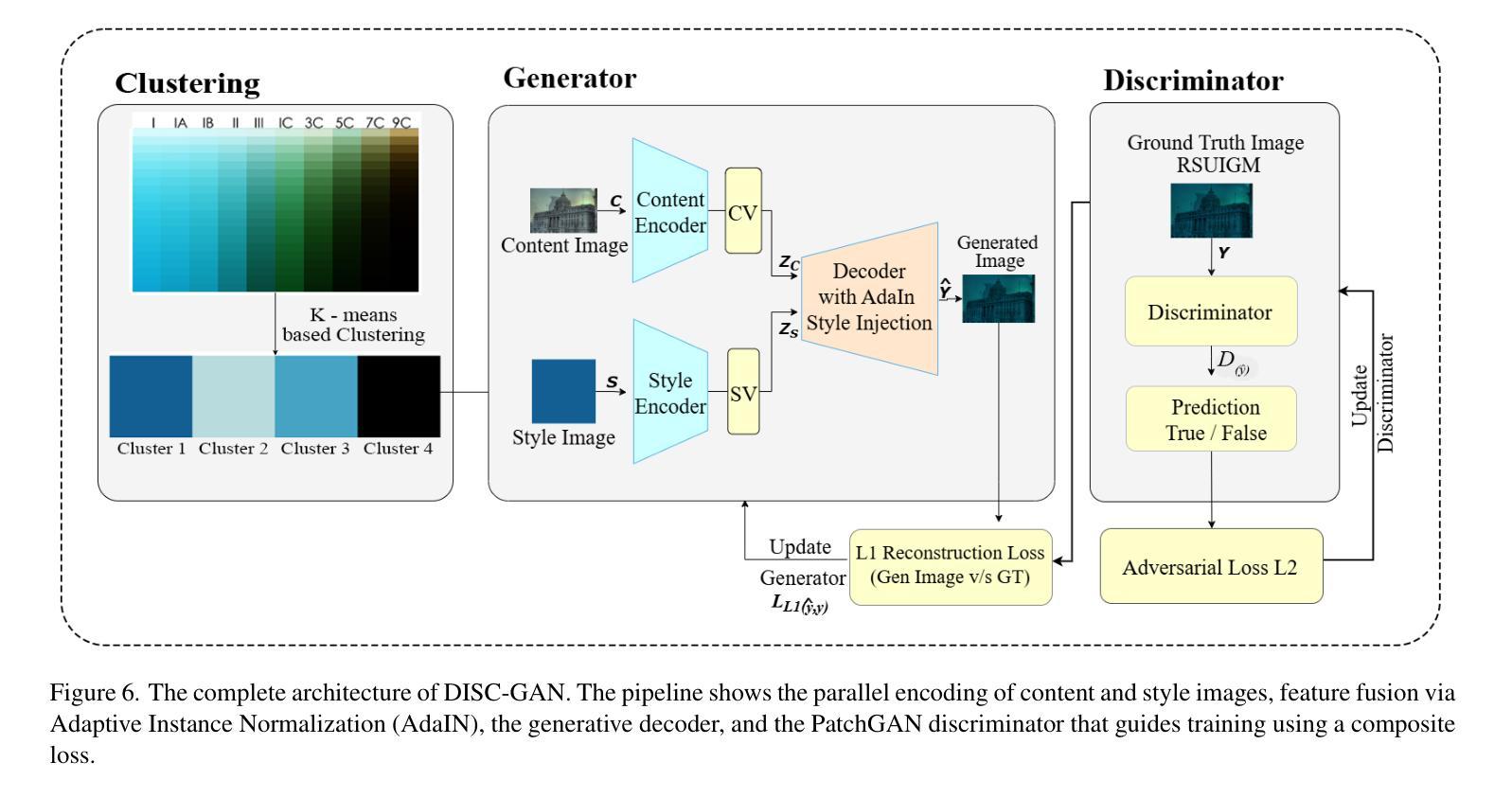 - DISC-GAN框架结合了风格内容解纠缠和特定集群的训练策略,用于水下图像合成。