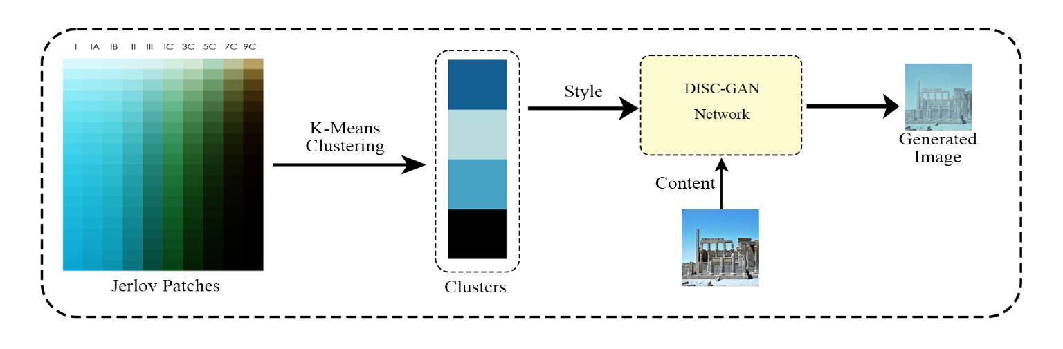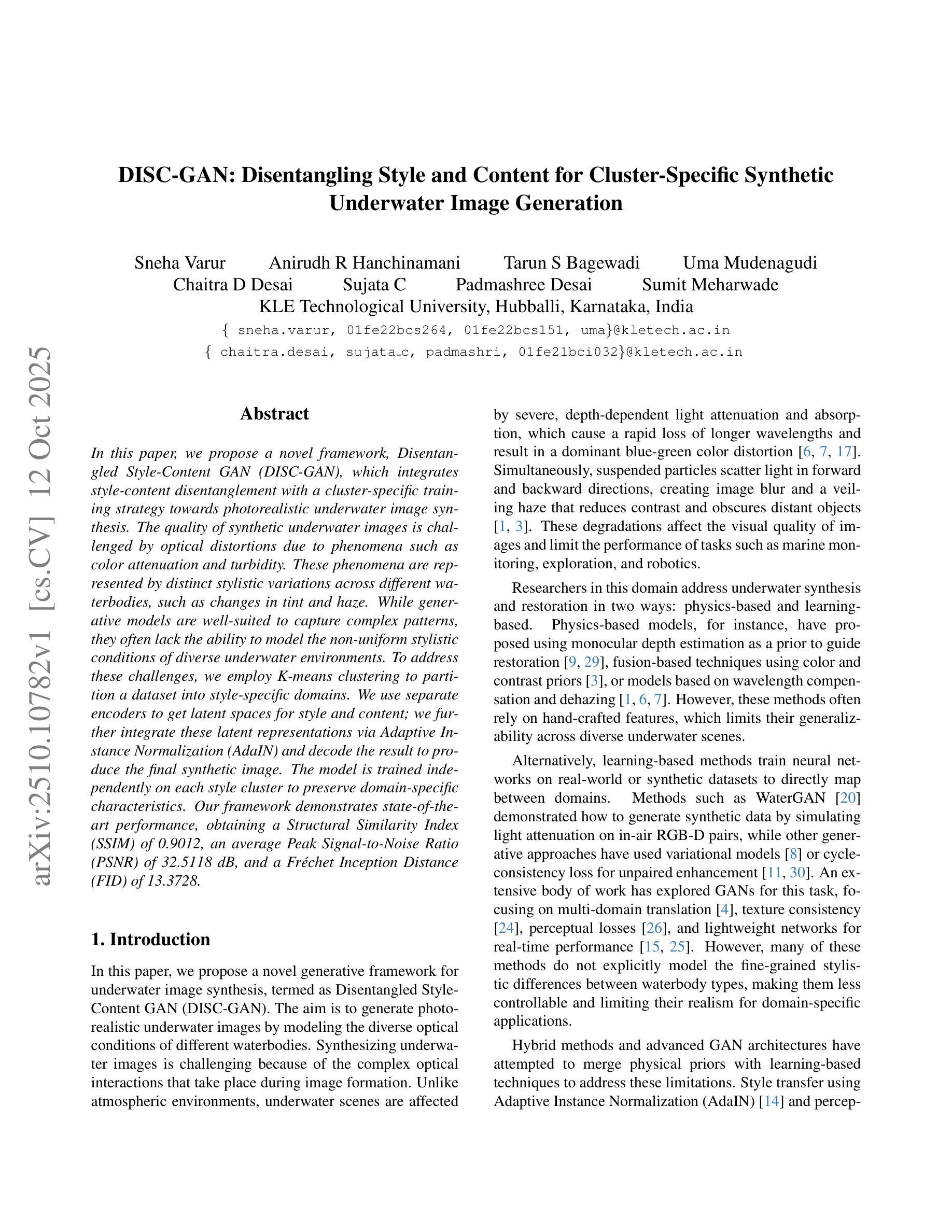 本文提出了一种新型框架——解纠缠风格内容GAN(DISC-GAN),它将风格内容解纠缠与特定集群的训练策略相结合,以实现逼真的水下图像合成。针对水下图像合成中因光学现象(如颜色衰减和浑浊度)导致的挑战,DISC-GAN通过K-means聚类将数据集分成特定风格的领域,并分别训练生成模型以模拟不同的水下环境。该框架采用单独的编码器获取风格和内容的潜在空间,并通过自适应实例归一化(AdaIN)整合这些潜在表示,以产生最终合成图像。该框架表现出卓越的性能。