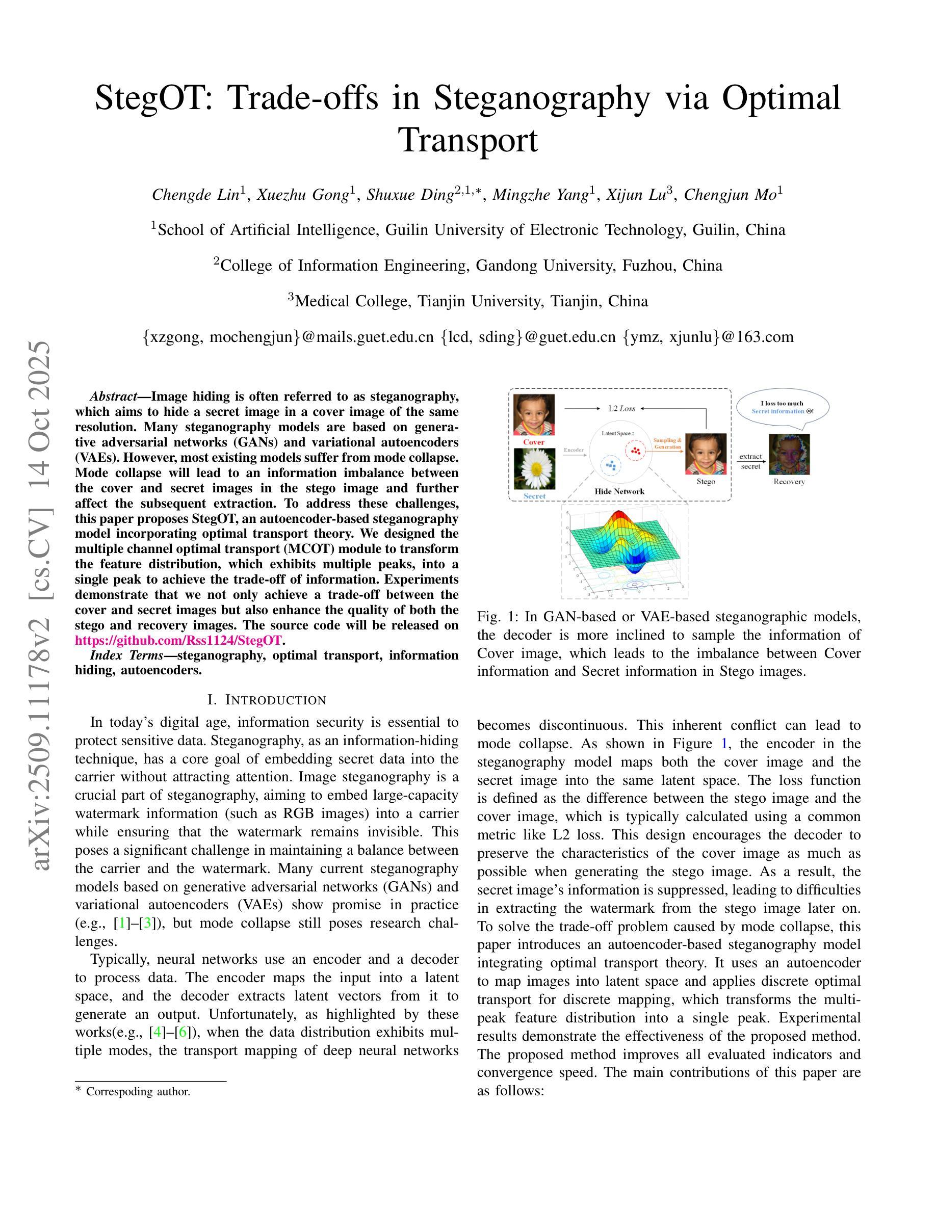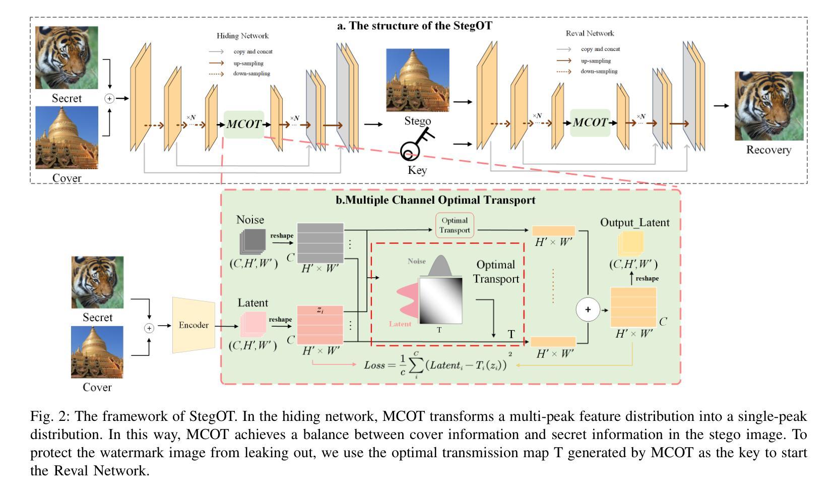 本文介绍了一种基于自编码器的隐写术模型StegOT,该模型结合了最优传输理论以解决隐写术中常见的模式崩溃问题。通过设计多通道最优传输(MCOT)模块,将特征分布的多峰转化为单峰,实现了信息平衡。实验证明,该方法不仅实现了覆盖图像与秘密图像之间的平衡,还提高了隐写和恢复图像的质量。