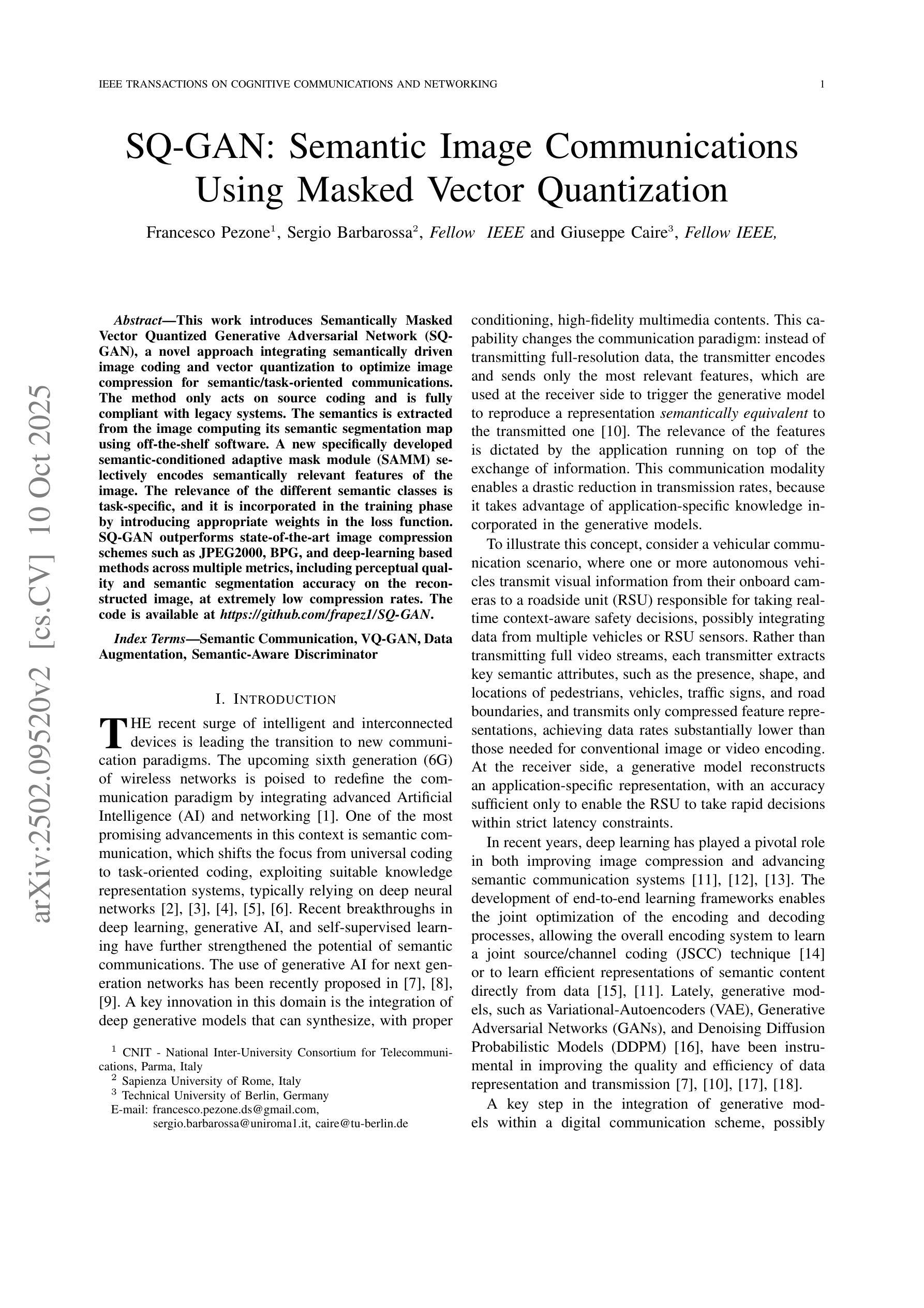 在这个工作中,提出了一个名为SQ-GAN的新型语义蒙版矢量量化生成对抗网络。这个方法将语义驱动图像编码和矢量量化相结合,旨在优化语义/任务导向通信的图像压缩效果。该方法只作用于源编码,兼容现有系统。利用市售软件计算图像的语义分割图来提取语义信息。通过引入语义条件自适应蒙版模块(SAMM),选择性编码图像中的语义相关特征。SQ-GAN在多个指标上优于当前最先进的图像压缩方案,包括JPEG2000、BPG和基于深度学习的技术,特别是在重建图像的感知质量和语义分割准确性方面,即使在极低的压缩率下也是如此。