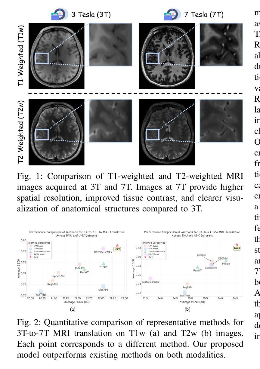 超高场7T MRI提供了更高的空间分辨率和组织对比度,能够检测到神经疾病中的细微病理变化。然而,由于基础设施成本和技术需求较高,7T扫描仪的有限可用性限制了其在临床上的广泛应用。利用计算合成技术从可获得的3T扫描图像生成7T质量的图像,是解决这一可访问性挑战的一种可行方法。现有的CNN方法存在空间覆盖范围有限的问题,而Transformer模型则要求过高的计算开销。RWKV架构为医学图像合成中的全局特征建模提供了一种有效的替代方案,结合了线性计算复杂度和强大的长距离依赖捕获能力。在此基础上,我们提出了基于RWKV架构的频率空间FS-RWKV(Frequency Spatial-RWKV),用于实现3T到7TMR图像翻译。为了更好地解决保留解剖细节和恢复全局组织对比度的问题,FS-RWKV引入了两个关键模块:(1)频率空间全方向移位(Frequency-Spatial Omnidirectional Shift,FSO-Shift),它执行离散小波分解,然后对低频分支进行全空间移位,以增强全局上下文表示的同时保留高频解剖细节;(2)结构保真度增强块(Structural Fidelity Enhancement Block,SFEB),该模块通过频率感知特征融合自适应地强化解剖结构。在UNC和BNU数据集上的综合实验表明,FS-RWKV在T1w和T2w模态上均持续优于现有的CNN、Transformer、GAN和RWKV基线方法,达到优越的解剖保真度和感知质量。