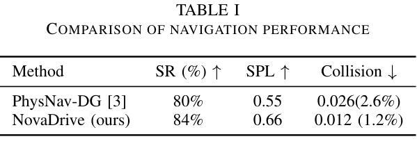 - 在基准测试中,NovaDrive相较于其他技术取得了更高的成功率、路径效率和更低的碰撞频率。