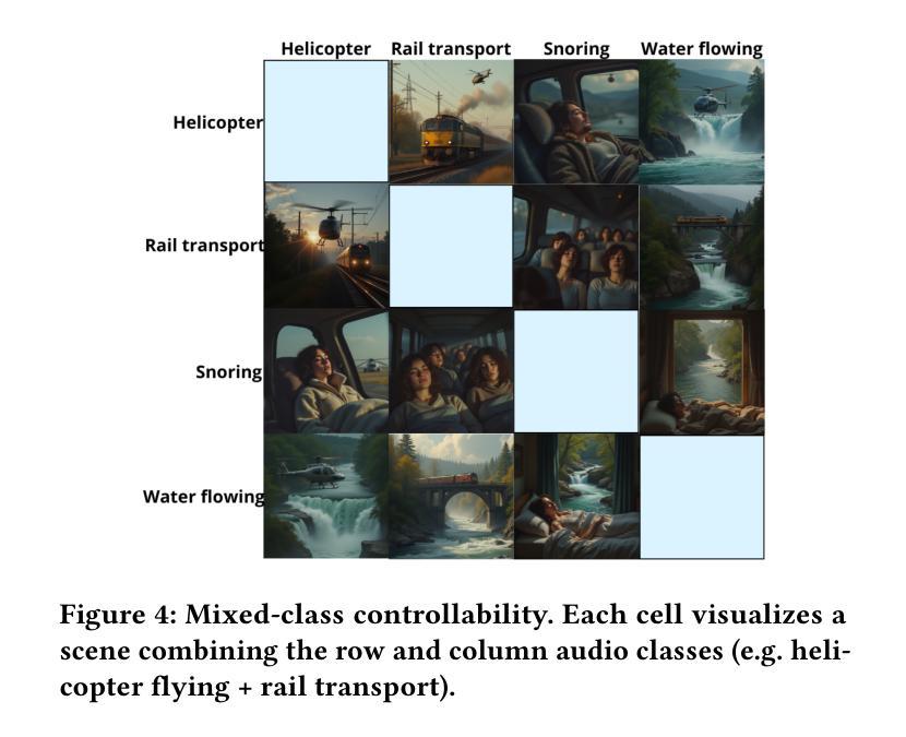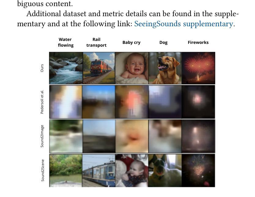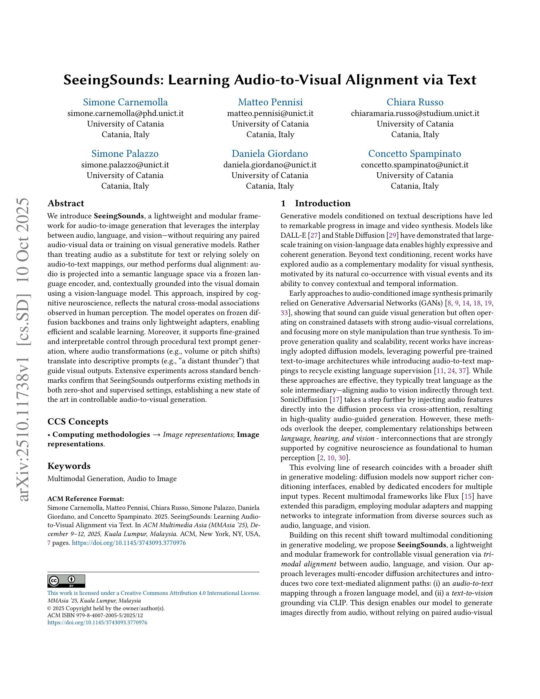 我们推出SeeingSounds,这是一个轻量级、模块化的音频到图像生成框架,它利用音频、语言和视觉之间的相互作用,无需任何配对音视频数据或在视觉生成模型上进行训练。我们的方法不是将音频视为文本的替代品,或者仅仅依赖于音频到文本的映射,而是进行双重对齐:音频通过一个冻结的语言编码器投射到语义语言空间,并使用视觉语言模型在视觉领域进行上下文定位。这种方法受到认知神经科学的启发,反映了人类感知中观察到的自然跨模态关联。该模型在冻结的扩散主干网上运行,只训练轻量级的适配器,实现了高效和可扩展的学习。此外,它支持通过程序性文本提示生成进行精细和可解释的控制,其中音频转换(例如音量或音调变化)转化为描述性提示(例如,“远处的雷声”),引导视觉输出。在标准基准测试上的大量实验证实,SeeingSounds在零样本和受监督环境中均优于现有方法,在可控的音频到视觉生成领域树立了新的业界标杆。