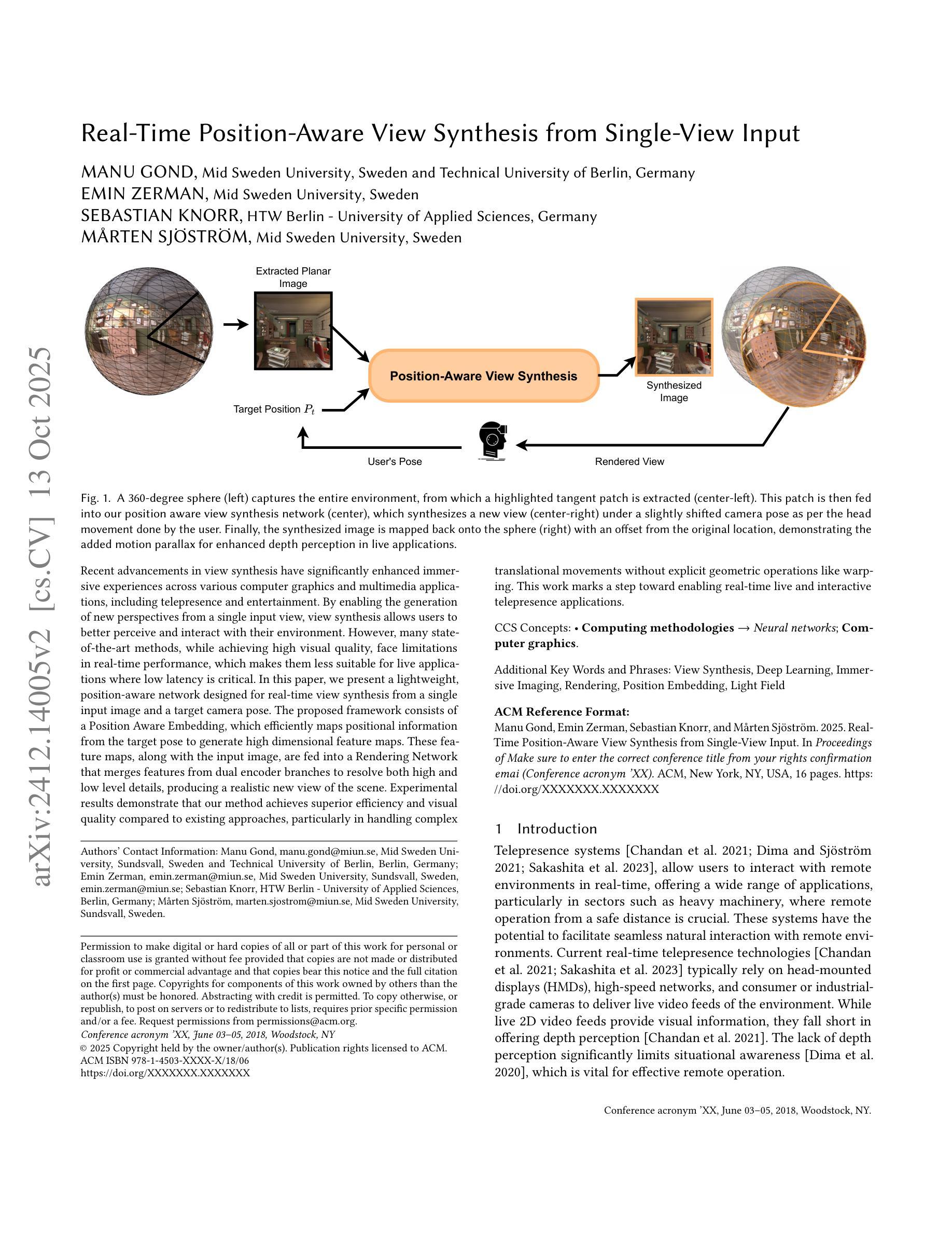 新一代视图合成技术增强了计算机图形和多媒体应用的沉浸式体验,包括远程存在和娱乐。通过单一视角生成新视角的能力,视图合成让用户更好地感知和交互他们的环境。但许多最新方法虽然视觉质量高,但实时性能有限,不适用于低延迟的实时应用。本文提出了一种轻量级、位置感知的网络,专为从单一输入图像和目标相机姿态进行实时视图合成而设计。该框架包括位置感知嵌入,有效地将目标姿态的位置信息映射到生成的高维特征图上。这些特征图与输入图像一起输入到渲染网络中,合并来自双编码器分支的特征以解决高级和低级细节问题,生成逼真的新场景视图。实验结果表明,该方法与现有方法相比具有更高的效率和视觉质量,特别是在处理复杂的平移运动方面,无需明确的几何操作如扭曲。这项工作朝着实现实时直播和交互式远程存在应用迈出了一步。