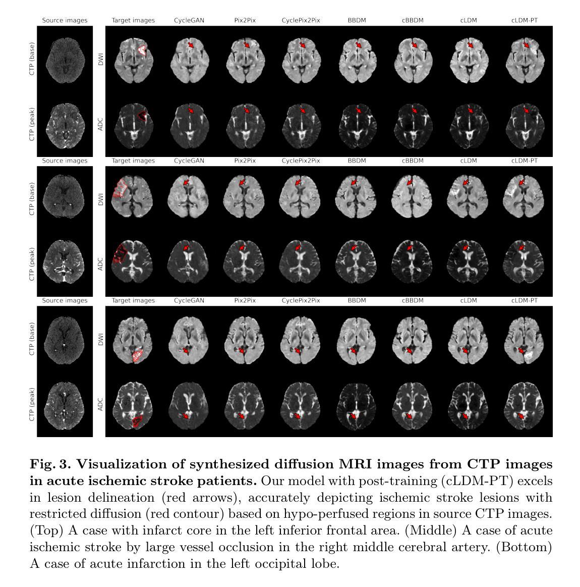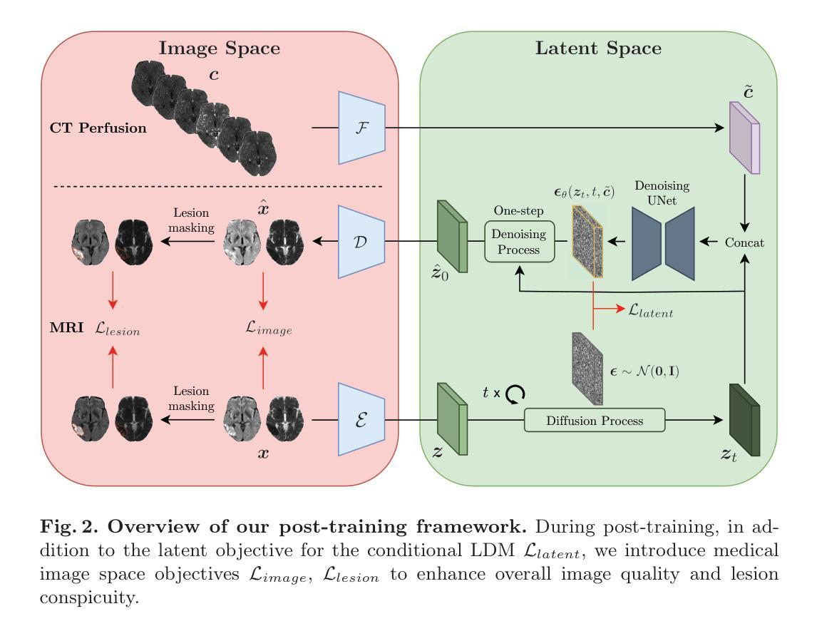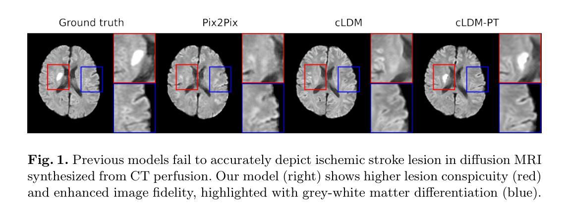 图像到图像的翻译模型可以帮助缓解医疗图像采集过程中存在的各种挑战。潜在扩散模型(LDMs)在压缩的潜在空间中实现了高效学习,构成了最先进的生成图像模型的核心。然而,这种效率是有代价的,可能会损害对高保真医疗图像至关重要的像素级细节。当生成临床上重要的结构(如病变)时,这种限制变得尤为重要,因为这些结构通常只占图像的一小部分。无法准确重建这些区域可能会严重影响诊断的可靠性和临床决策。为了克服这一限制,我们提出了一种新型的后训练框架,用于医学图像到图像翻译中的LDM,通过引入病变感知医学像素空间目标。这种方法至关重要,因为它不仅提高了整体图像质量,而且提高了病变勾勒的精确度。我们在急性缺血性卒中患者的脑部CT到MRI翻译中评估了我们的框架,早期和准确的诊断对于选择最佳治疗方案和改善患者预后至关重要。虽然扩散MRI是卒中诊断的金标准,但其临床实用性往往受到成本高和可及性低的限制。我们使用包含817名患者的数据集证明了我们的框架在合成DWI和ADC图像时的效果,这些图像是从CT灌注扫描中得出的,我们的框架提高了整体图像质量并增强了病变的勾勒能力,超越了现有的图像到图像翻译模型。此外,我们的后训练策略可以轻松适应预训练的LDM,并在各种医疗图像翻译任务中具有巨大的应用潜力。