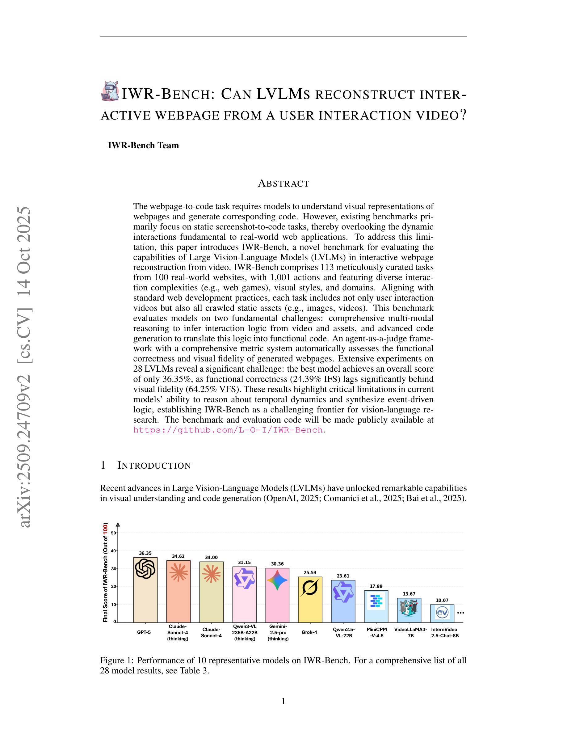 - IWR-Bench是一个新的基准测试,用于评估模型从视频中进行交互式网页重建的能力。