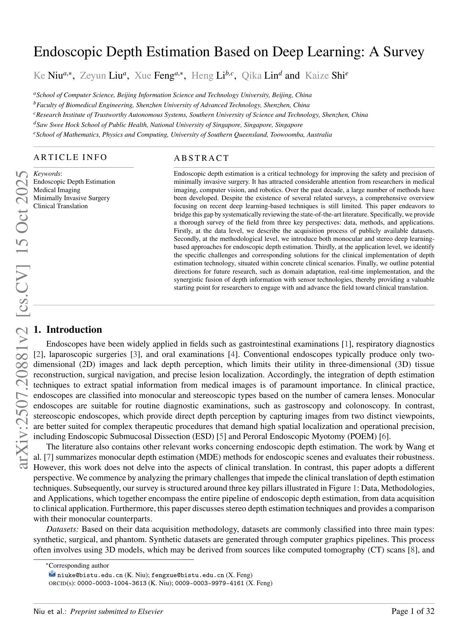 - 综述文章系统介绍了基于深度学习的内镜深度估计技术的最新进展。