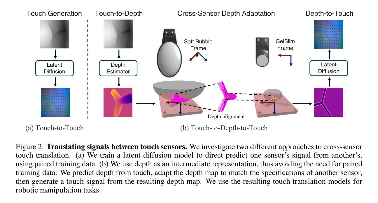 当前的视觉触觉传感器有各种形状和大小,这为开发通用触觉表征带来了挑战。这是因为大多数模型都与特定的传感器设计相关联。为了应对这一挑战,我们提出了两种跨传感器图像生成方法。第一种是端到端的方法,它利用配对数据(Touch2Touch)。第二种方法建立中间深度表征,不需要配对数据(T2D2:Touch-to-Depth-to-Touch)。两种方法都通过跨传感器触摸生成过程,使得特定传感器的模型能够在多个传感器上使用。根据数据可用性和应用需求,这些模型为传感器转换提供了灵活的解决方案。我们在下游任务(例如手部姿态估计和行为克隆)上证明了它们的有效性,成功地将一个传感器上训练的模型转移到另一个传感器上。项目页面:https://samantabelen.github.io/cross_sensor_touch_generation