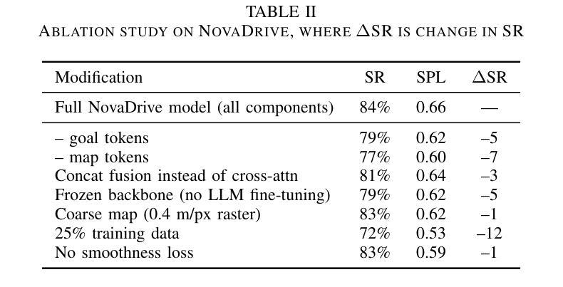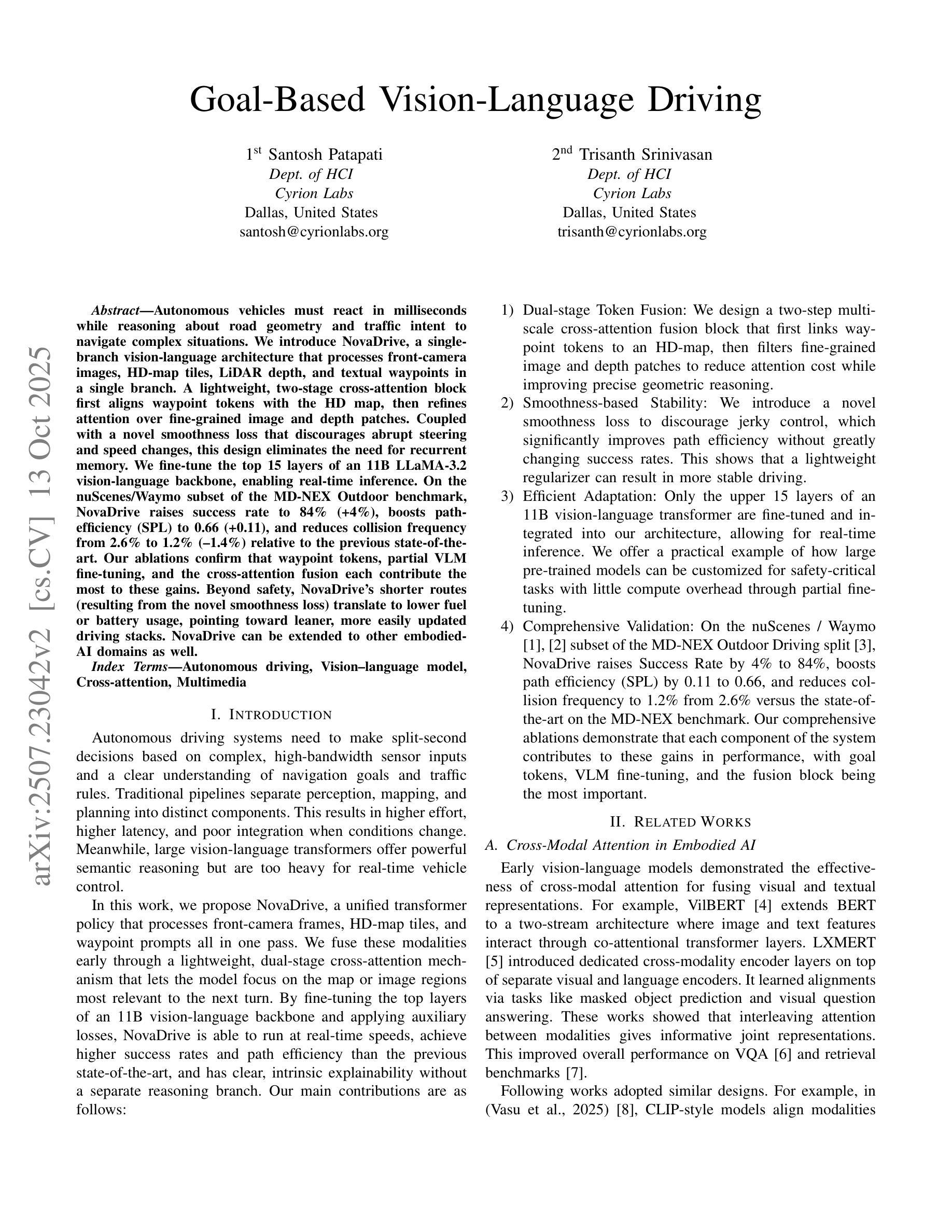 我们引入了NovaDrive,这是一种单分支视觉语言架构,能够在单个分支中处理前置摄像头图像、高清地图瓦片、激光雷达深度和文本航点。通过一个轻便的两阶段交叉注意力块,首先对齐航点标记与高清地图,然后精细调整图像和深度补丁的注意力。结合一种新型平滑损失,该设计可避免急转弯和速度突变,消除了对循环内存的需求。我们微调了11B LLaMA-3.2视觉语言主干的顶层15层,实现了实时推理。在MD-NEX户外基准的nuScenes/Waymo子集上,NovaDrive将成功率提高到84%(+4%),路径效率(SPL)提高到0.66(+0.11),与之前的最新技术相比,碰撞频率从2.6%降低到1.2%(-1.4%)。我们的消融实验证实,航点标记、部分VLM微调以及交叉注意力融合都对这些增益贡献最大。除了提高安全性外,NovaDrive的更短路线(由新型平滑损失产生)转化为更低的燃油或电池使用量,指向更精简、更容易更新的驾驶堆栈。NovaDrive还可以扩展到其他实体人工智能领域。