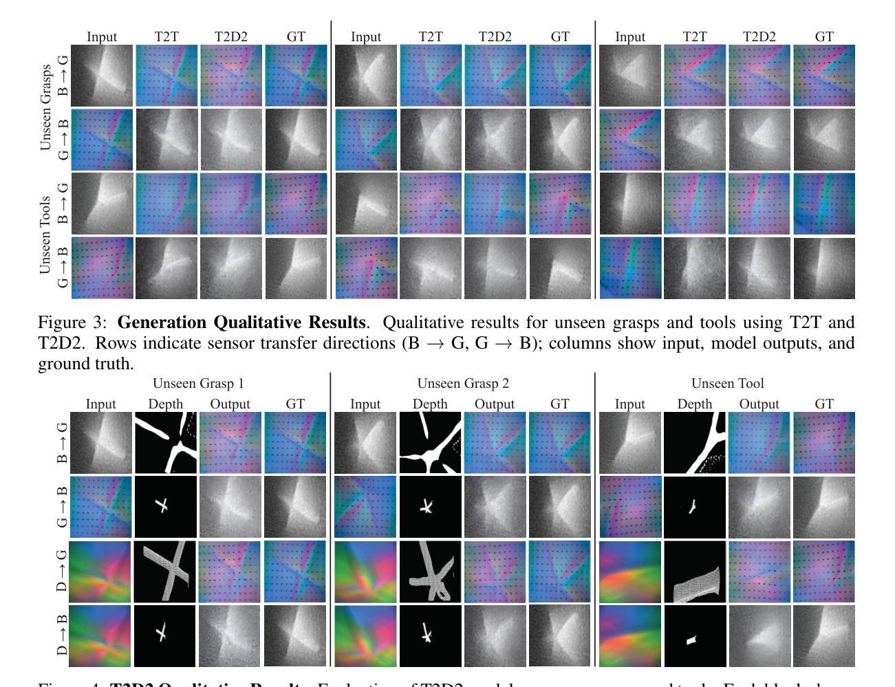 - 提出两种跨传感器图像生成方法:端到端的配对数据方法(Touch2Touch)和构建中间深度表示的方法(T2D2)。