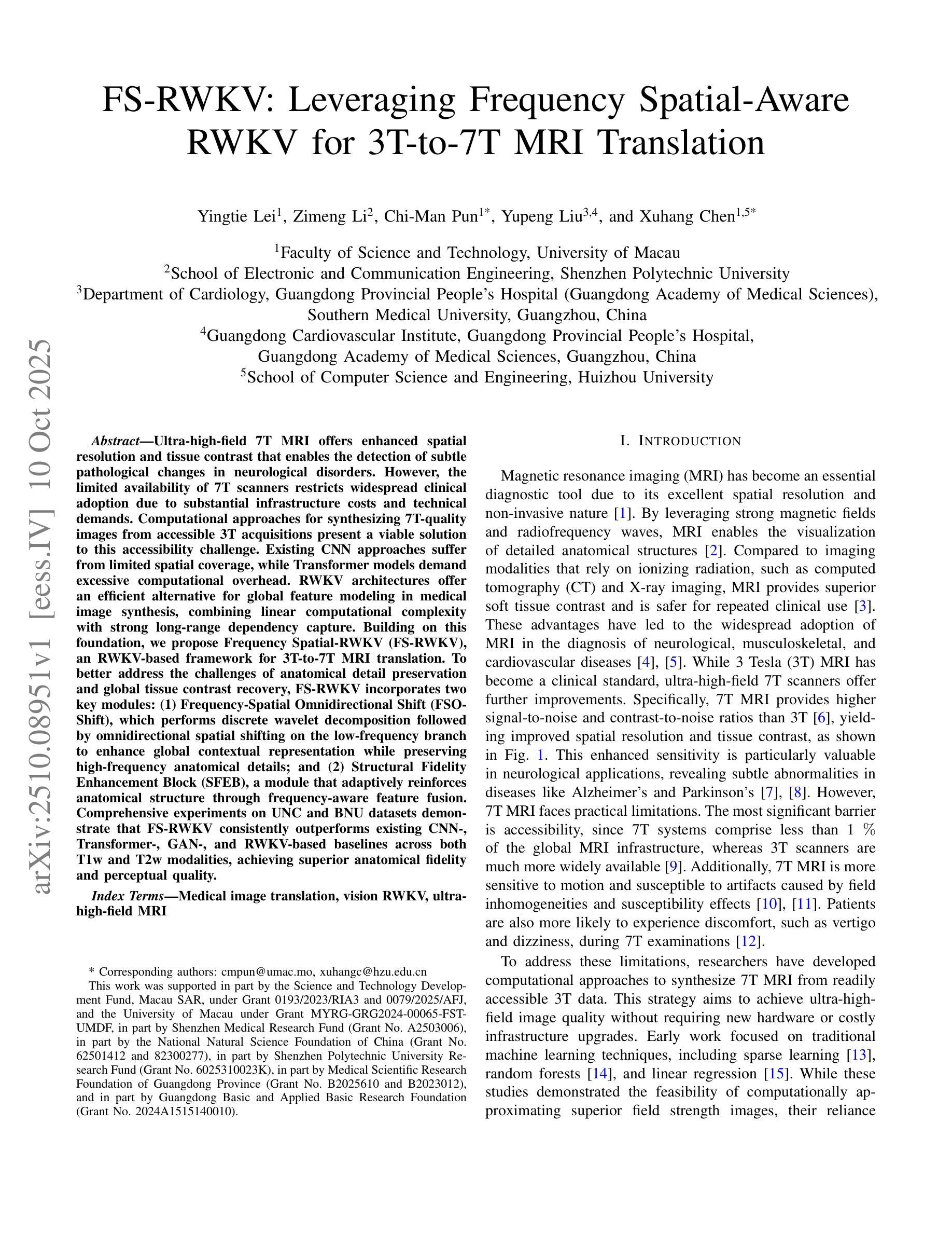 本文介绍了超高场7T MRI的技术优势及普及难点,提出了基于RWKV架构的Frequency Spatial-RWKV(FS-RWKV)框架,用于从可获取的3T MRI图像合成7T质量的图像。该框架包含两个关键模块:Frequency-Spatial Omnidirectional Shift(FSO-Shift)和Structural Fidelity Enhancement Block(SFEB),旨在增强全局上下文表征并保留高频解剖细节,同时自适应地强化解剖结构。实验证明,FS-RWKV在UNC和BNU数据集上均优于现有CNN、Transformer、GAN和RWKV基线方法,在T1w和T2w模态下实现优越的解剖保真度和感知质量。